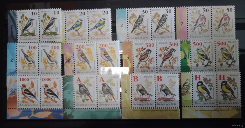 Марки Беларуси полная серия девятый стандарт 2006 года, в сцепках, фауна, Птицы сада, заказы, цифра "2"