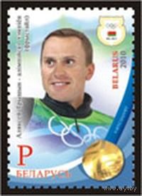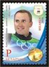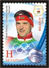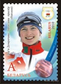 Марки "Дарья Домрачева - бронзовый призёр XXI зимних Олимпийских игр в Ванкувере по биатлону", "Сергей Новиков - серебряный призёр XXI зимних Олимпийских игр в Ванкувере по биатлону", "Алексей Гришин