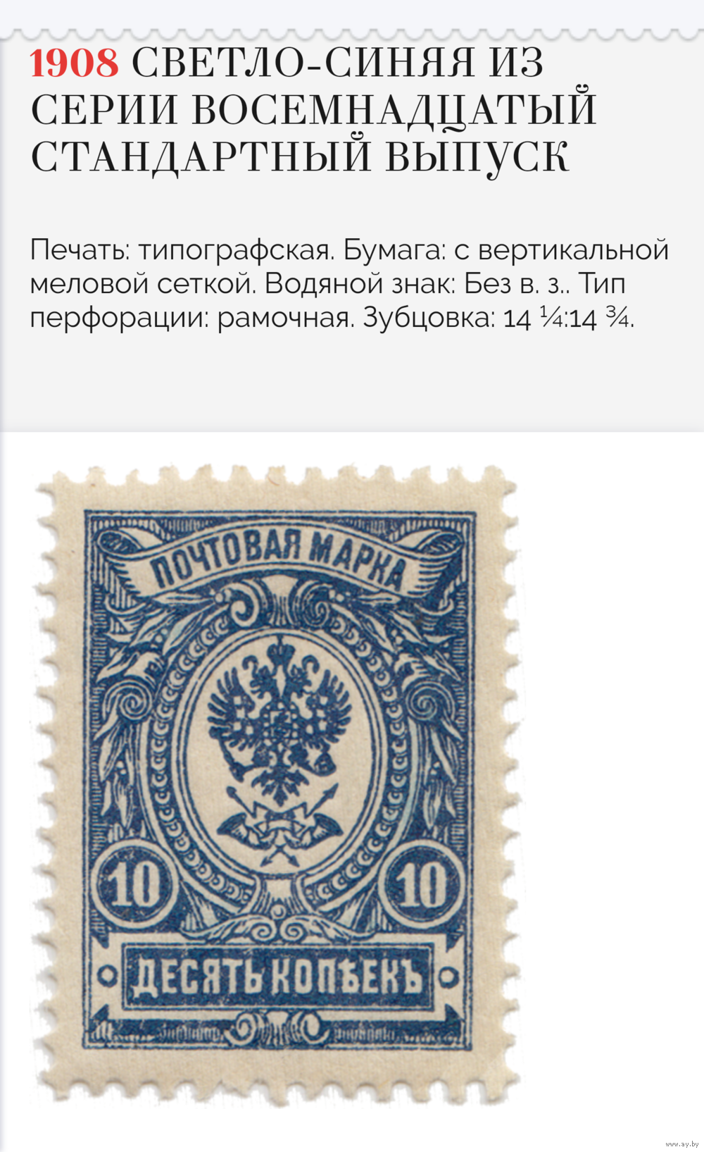 Марка почтовая. Рос. империя. 10 копеек. 1908 г.. Неиспользована. Вариация цвета (чёрно-синяя). Оригинальный клей. МNH. Центровка по шкале PSE - Extremelly Fine. Отличный сохран.