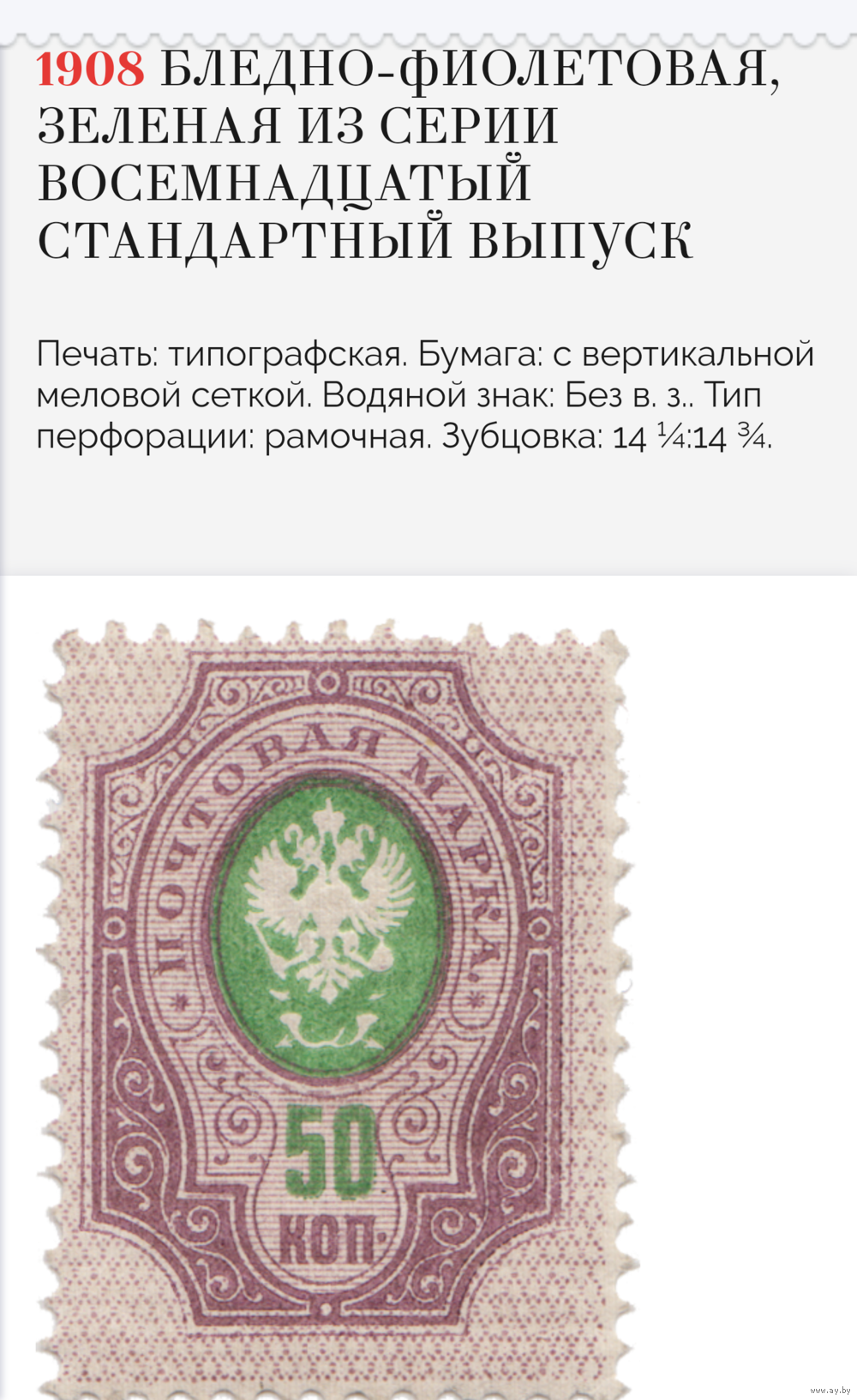 Марки почтовые. Рос. империя. 50 копеек. 1908 г.. Пара. Вертикальная мелованная сетка. Разновидность. Перф. 14×14.3/4 (вместо 14.1/4×14.3/4). Коричневая (вместо бледно-фиолетового). Неиспользованы. Оригинальный клей. MNH. Центровка по шкале PSE - XF/Suberb. Идеальный сохран.