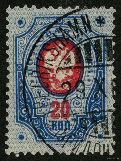 ВКФ, 20 копеек. 1889-1902 (1891). Использована. Гориз. верже. Гориз. вод. знак "ЭЗГБ" (разновидность**). Гашение "Fredrikshamn" (символичное и редкое гашение*). Перф. - 14¼ x 14¾. Разновидность. (Стандартная - 14 x 14½). Отличный сохран. PSE grading scale - VF/XF.