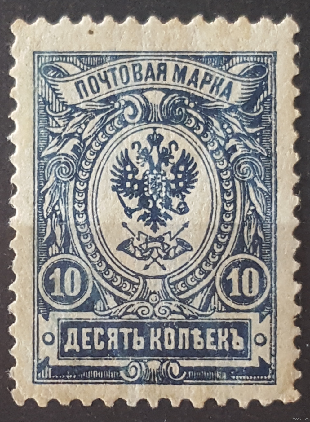 Марка почтовая. Рос. империя. 10 копеек. 1908 г.. Разновидность. (Особенности: вариация цвета (чёрно-синяя вместо выпускавшихся светло-синей и голубой)). Неиспользована, MNH, + идеальный сохран. Оригинальный клей. PSE grading scale - Extremelly Fine.