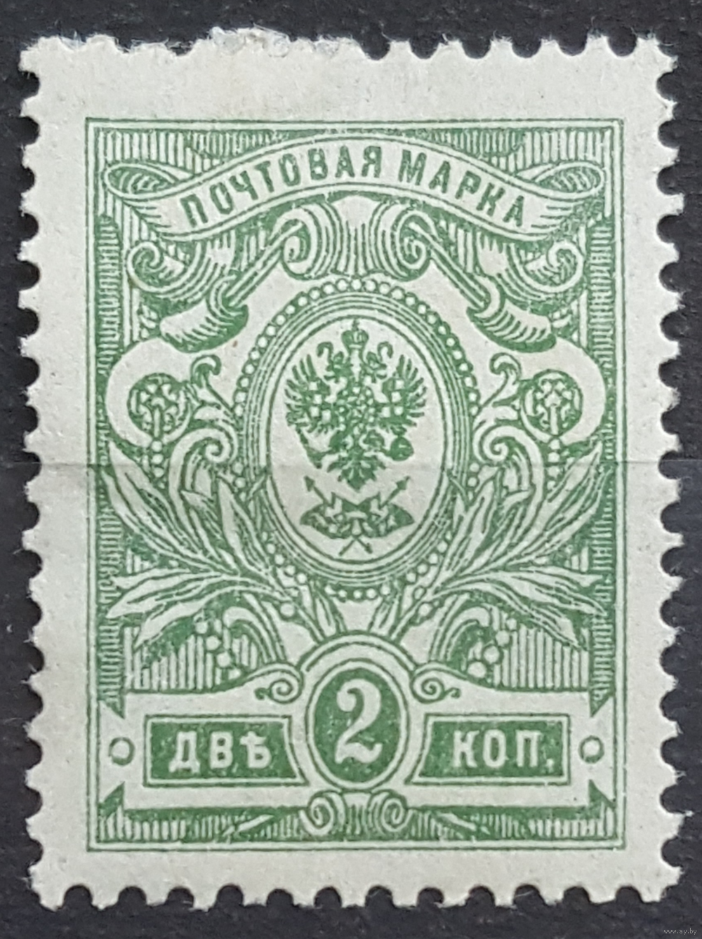 Марка почтовая. Рос. империя. 2 копейки.1908 г.. Разновидность. (Особенности: цвет зелёный вместо представленного в каталоге жёлто-зелёного (бумага белая); перфорация 14х14.1/2 (вместо выпускавшейся 14.1/4х14.3/4); без меловой сетки). Без водяного знака. Неиспользована, MNH, + идеальный сохран. Оригинальный клей. След от наклейки. PSЕ grading scale - VF/XF.