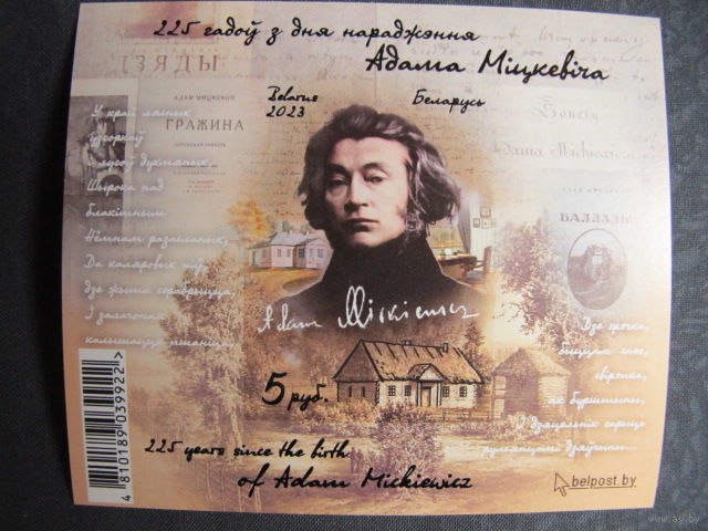 Марки РБ 1543А. Блок 162А. 225 лет со дня рождения Адама Мицкевича. Беззубцовый