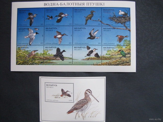 Марки РБ ##186-197. МЛ Водно-болотные птицы + #198 Блок Обыкновенный бекас