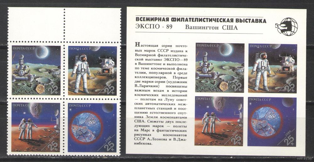Предлагается серия марок "Космос. Филвыставка ЭКСПО-89" Михель 6020/23 бл.210 (6.2 евро).