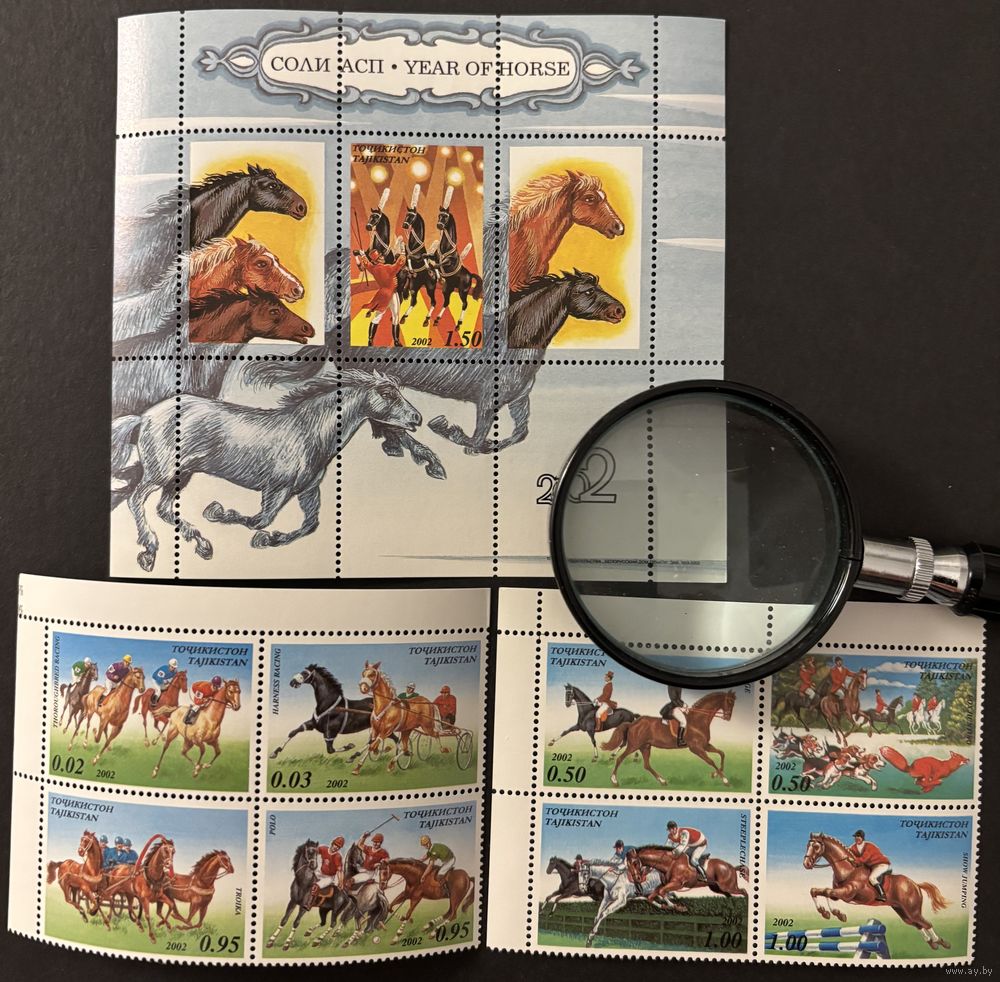 Марки Таджикистан 2002 Фауна. Год лошади. Лошади. Скачки. Блок и два квартблока. Полная серия MNH