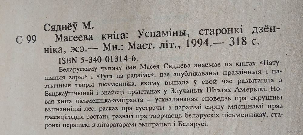 Масей Сяднёў. Масеева кнiга. Мінск. Мастацкая літаратура. 1994 г.г 318 с. Цверды пераплет. Кішэнны фармат.