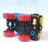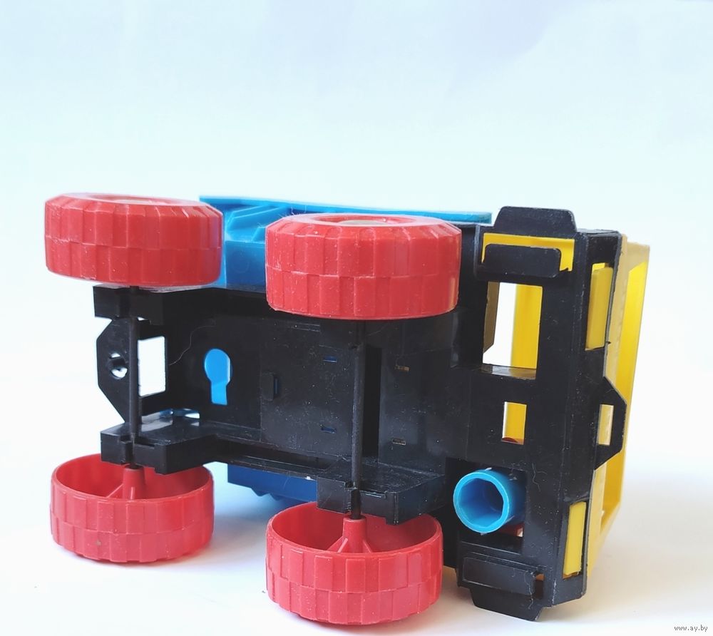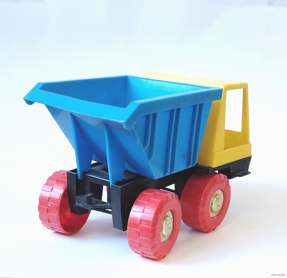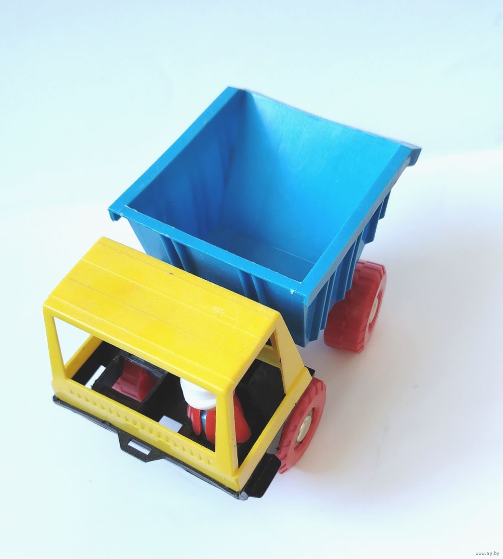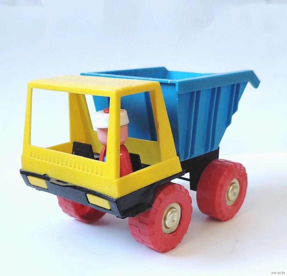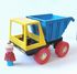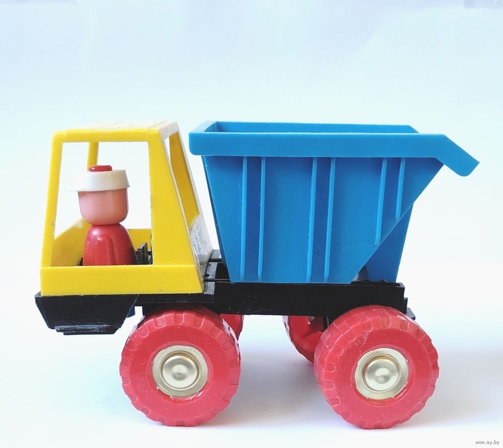Яркая желто-синяя кабина и кузов, красные колеса, наличие фигурки водителя. Откидывающийся кузов.