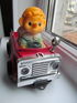Машинка ездит по кругу, (нужна гладкая поверхность, не ковер) при столкновении с препятствием дает назад и движется дальше, при езде мигают фары. Фигурка из резины, можно вынимать. Частично восстановлены детали привода колес, на фото видно. Работает от плоской батарейки 3R12.