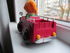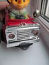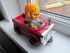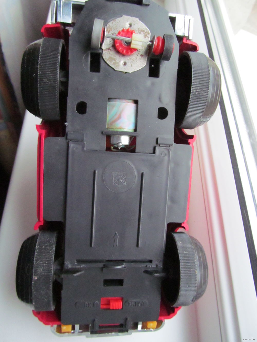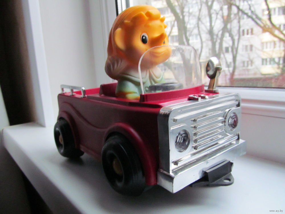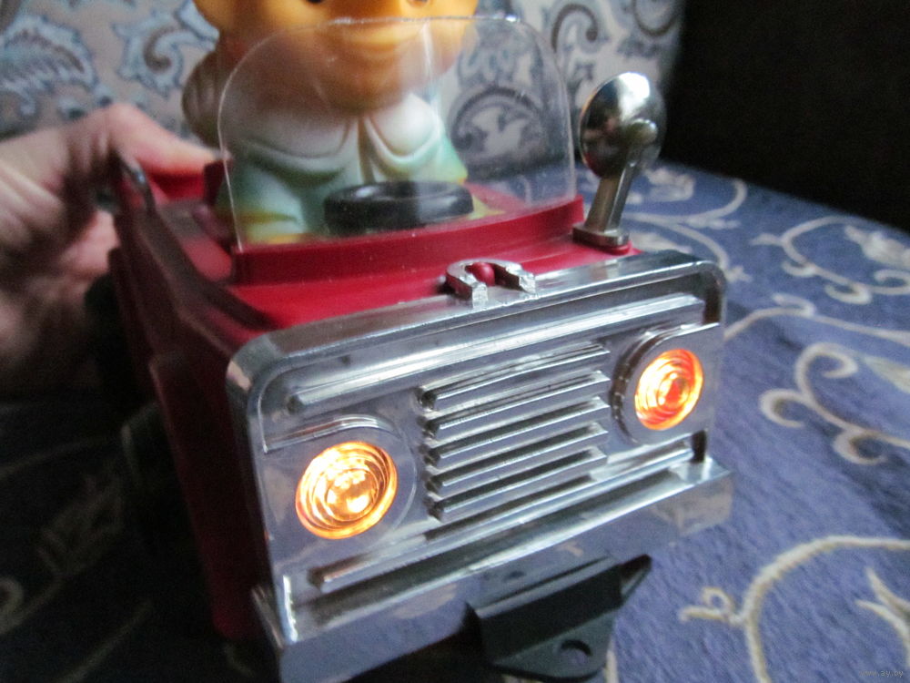 Машинка ездит по кругу, при столкновении с препятствием дает назад и движется дальше, при езде мигают фары. Фигурка из резины, можно вынимать. Частично не родные детали привода колес, на фото видно. Работает от плоской батарейки 3R12.