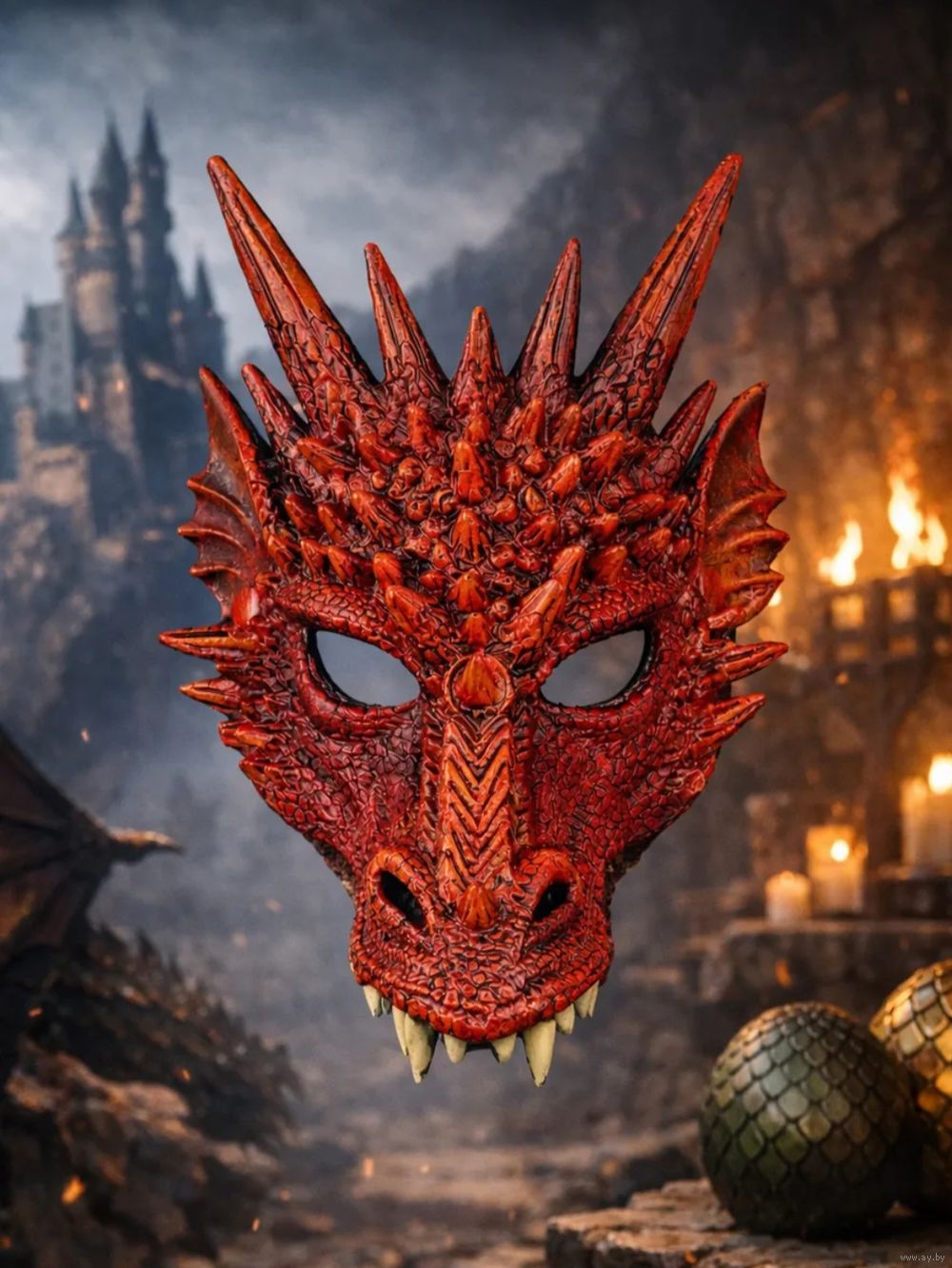 Маска карнавальная Дракон, цвет красный, материал: вспененый пластик, крепление в виде резинки. Размер: 31 х 26 см. Использовалась один раз в качестве аксессуара для фотосессии. Подходит взрослым и детям.