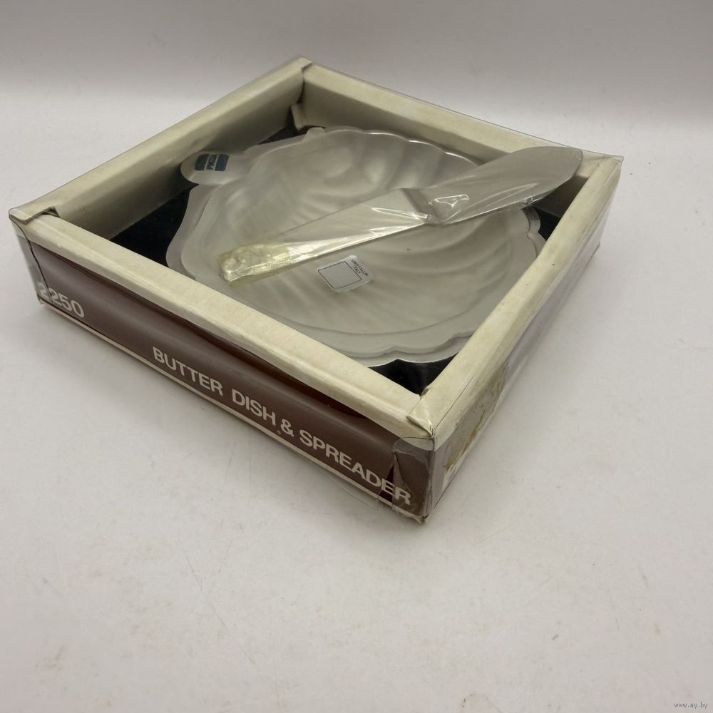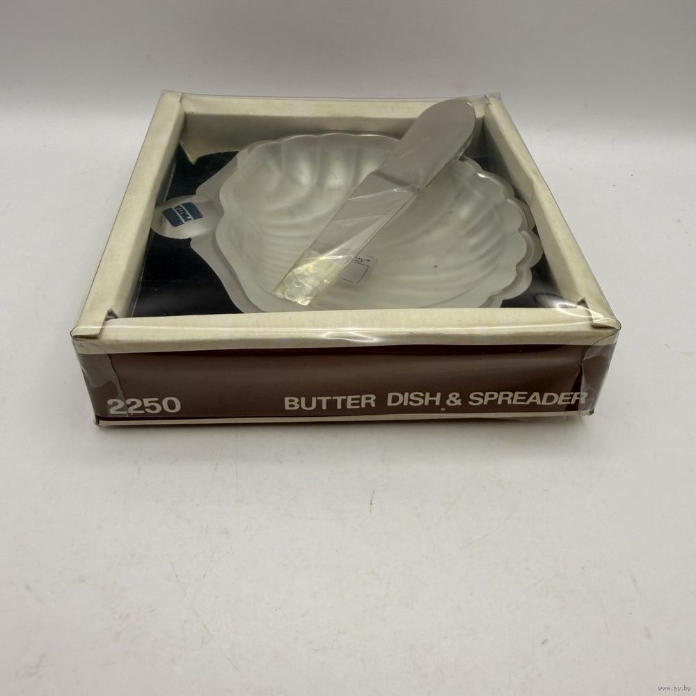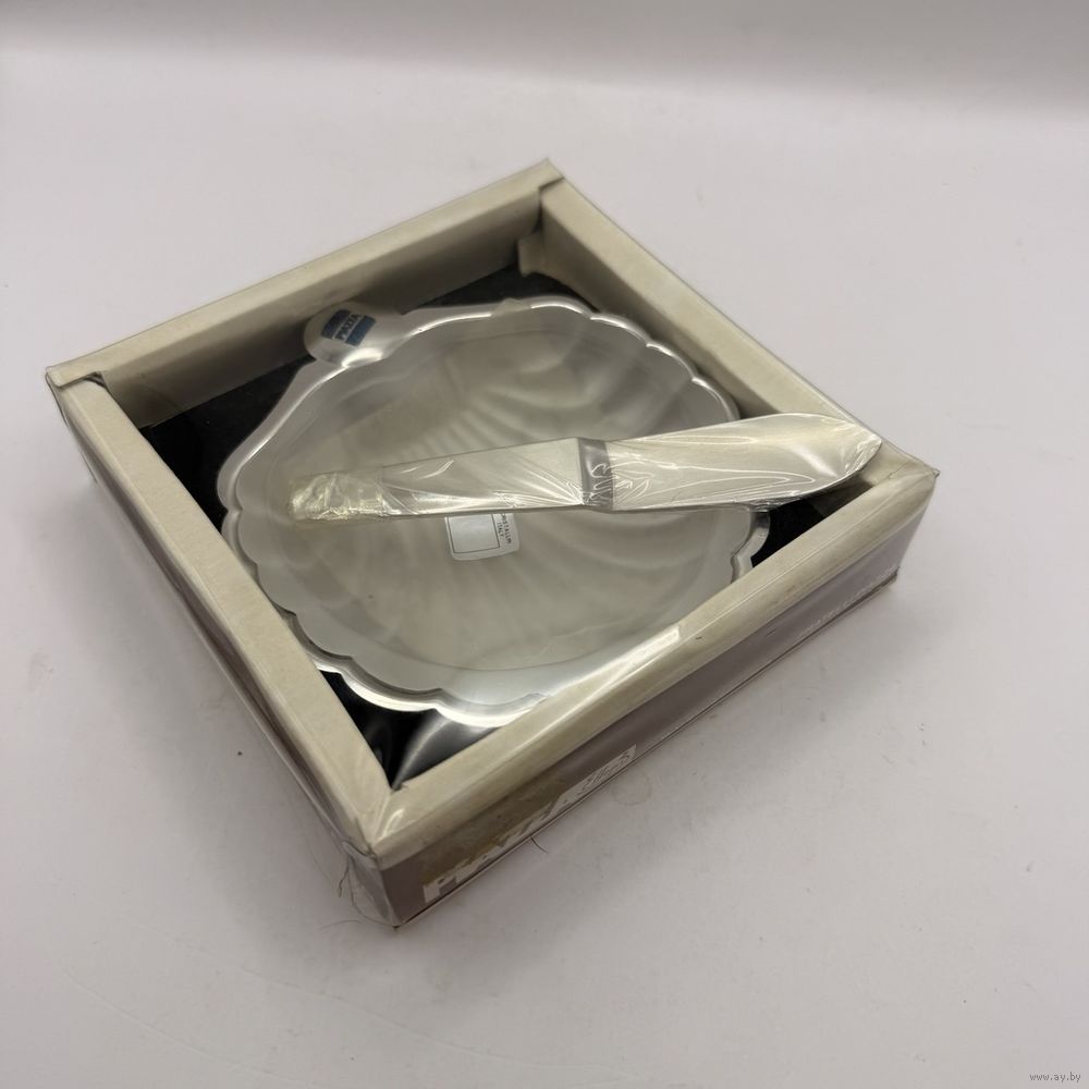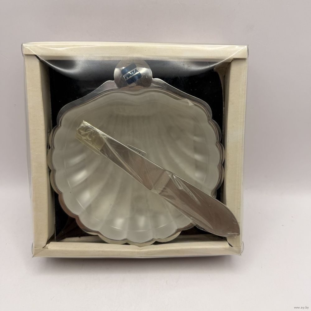 Винтажная масленка-икорница из высококачественной нержавеющей стали в форме створки ракушки с вставкой из матового стекла. В комплекте с лопаткой. Италия. 1960-е г.г. Изготовлена из высококачественной нержавеющей стали, устойчивой к коррозии. В оригинальной коробке, со стикерами производителя. Размер 10 х 11 х 2,5 см. Размер коробки 12,5 х 12,5 х 3,5 см. В использовании не была.