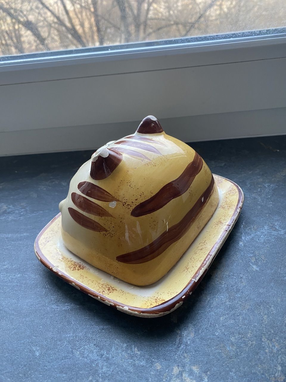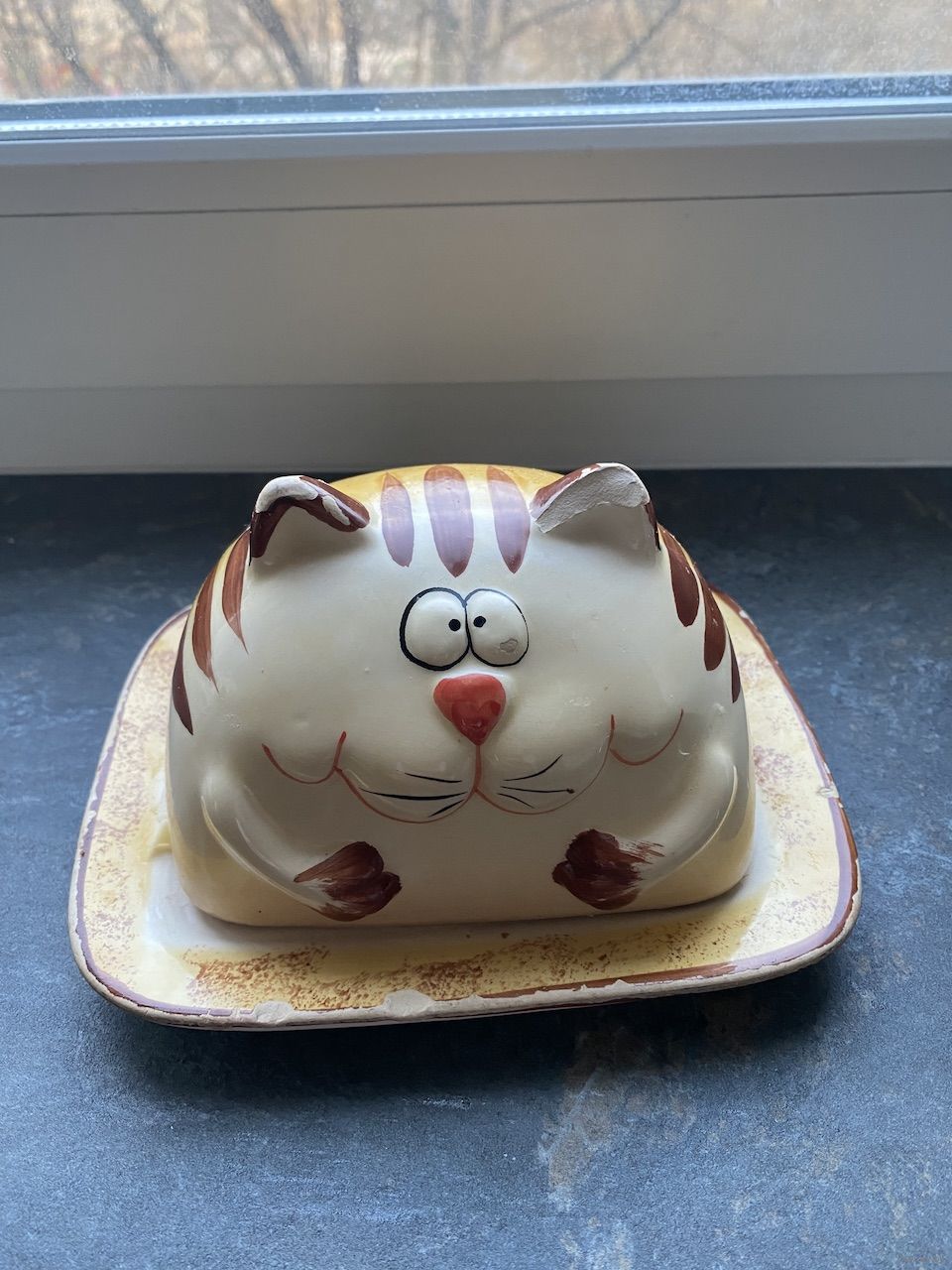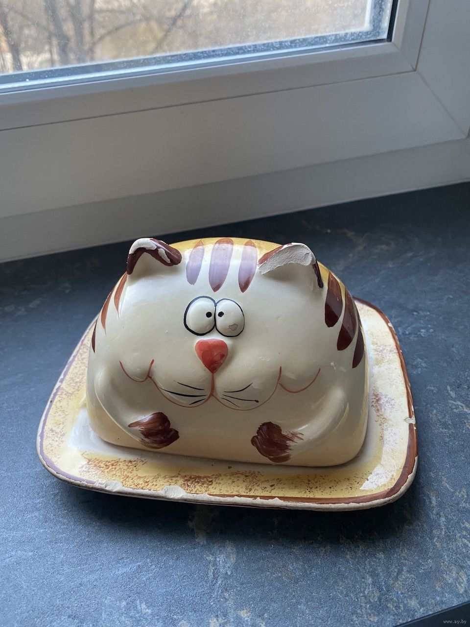 Масленка керамическая рыжий кот, состояние приемлемое, есть незначительные сколы, размер 16х13 высота 9 см.