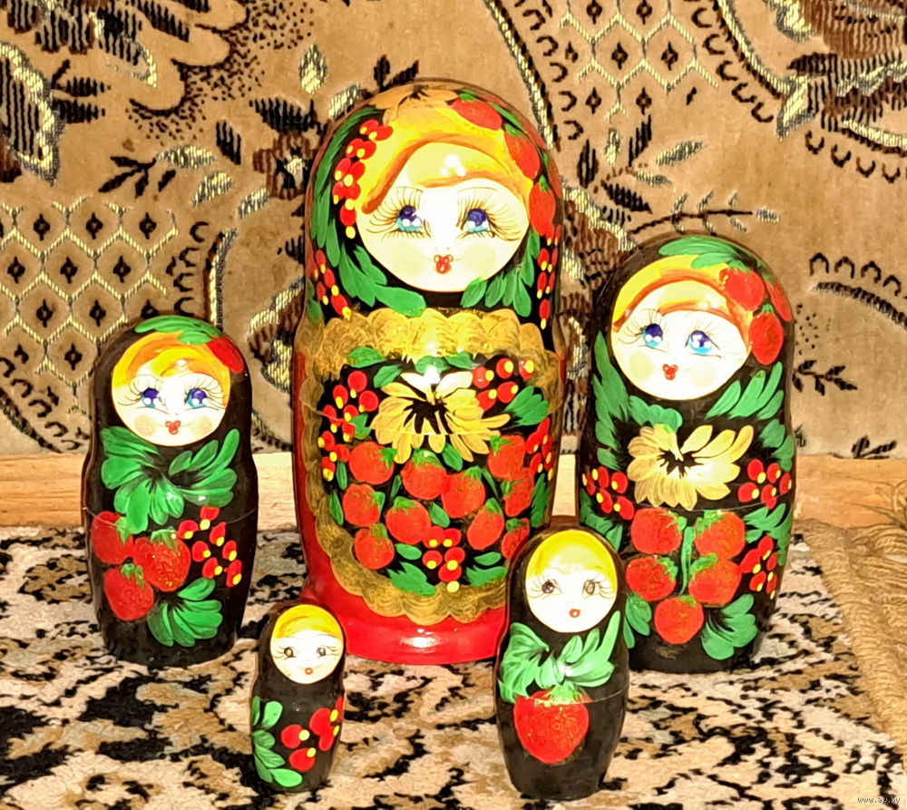 Матрешка деревянная высотой 16.5см, в наборе пять кукол: все они, кроме маленькой, открываются и вкладываются друг в друга. Сувениры сделаны из дерева, поэтому их не рекомендуется мыть под струёй воды: древесина при намокании разбухает. При необходимости можно протереть влажной тканью.