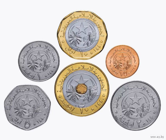Мавритания набор монет 1,2, 1, 2, 5, 10, 20 угий, UNC. Триметалл! Жераф. Бык. Двоякодышащая рыба. Музыкальные инструменты. Куфшин. Герб - звезда, пальма, тростник. Предложи свою цену или обмен!