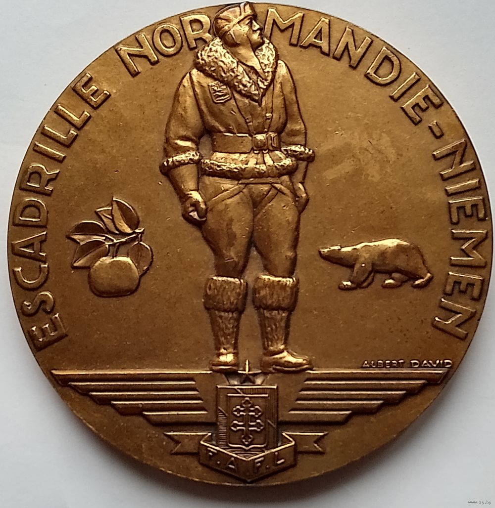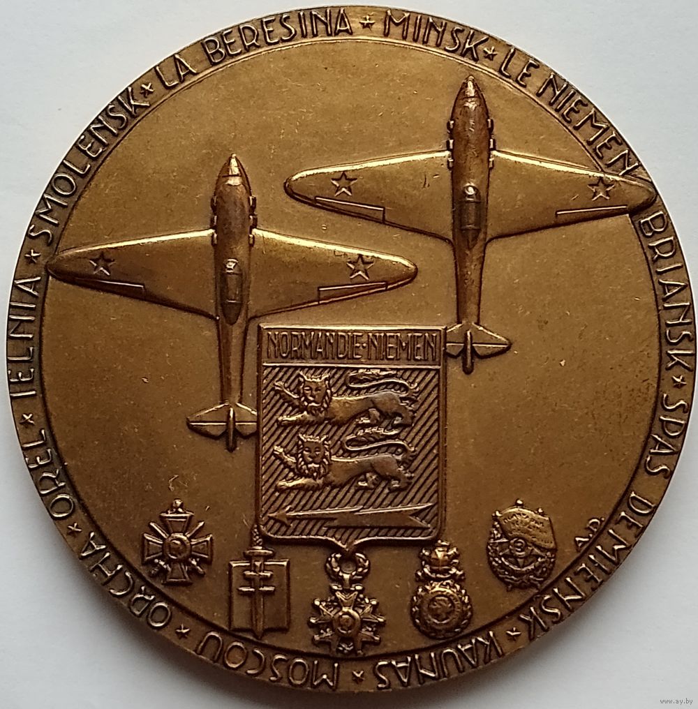 Памятная медаль Эскадрилья Нормандия Неман. Парижский монетный двор, 1980-е гг. Медальер Аlbert David. Бронза, вес 180,02 г. Диаметр 68,0 мм. На гурте клейма Парижского монетного двора. Литература: Сatalogue General Illustre des Editions de la Monnaie de Paris, vol. 4/1, p. 554-B. Отличная сохранность. На медали по окружнасти написаны места (в том числе в Беларуси), где воевали летчики этой эскадрильи: Москва, Орша, Орел, Ельня, Смоленск, река Березина, Минск, река Неман, Брянск, Каунас. Интересный предмет в коллекцию