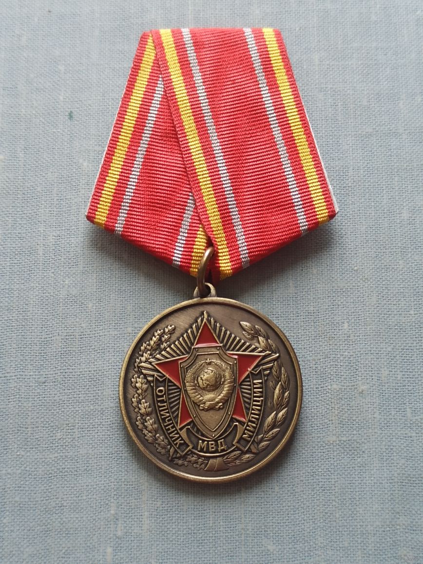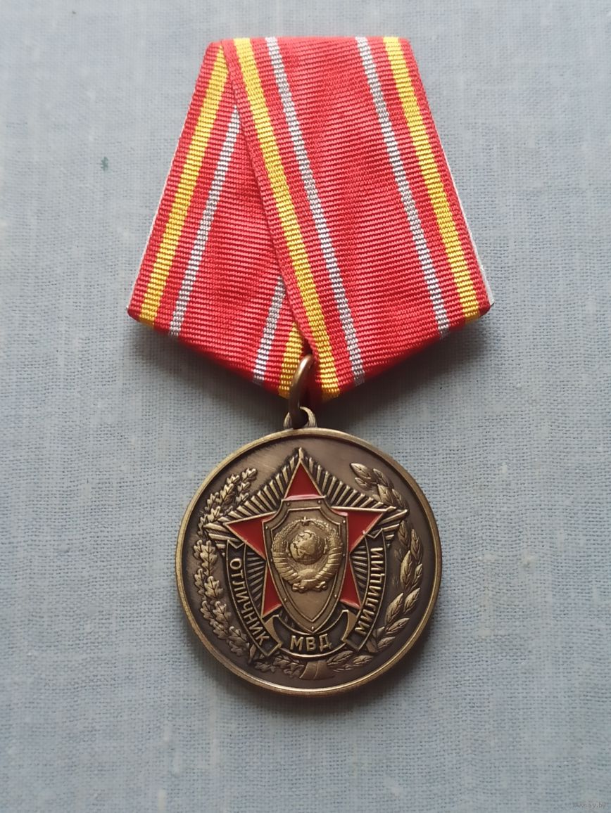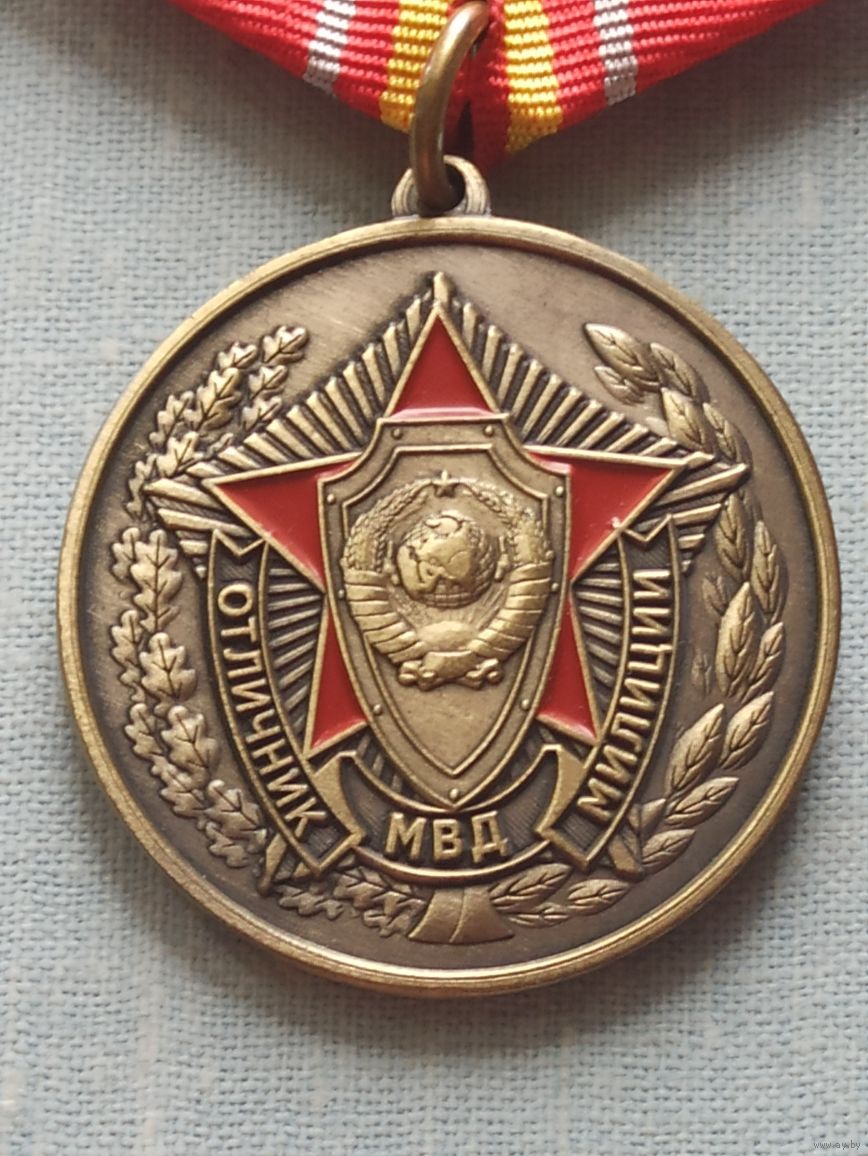 Награда изготовлена из латуни. На лицевой стороне, наложенная на штраловую бледно-золотистую звезду, располагается пятиконечная красная звезда. Поверх неё лежит щит, на котором изображён большой герб СССР. По краям композиция обрамлена слева дубовой ветвью, а справа лавровой. Внизу расположена лента с надписью «МВД ОТЛИЧНИК МИЛИЦИИ».