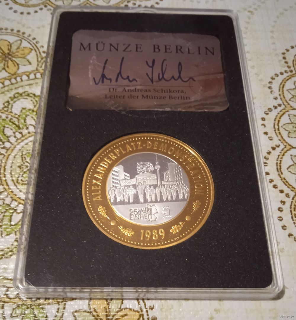 Медаль посвященная 25 летию единства Германии. Диам. - 32мм. Центр - серебро 999 пробы, ободок - медь с золочением (гальваническое покрытие меди золотом 999 пробы.) Выпуск - Muenze Berlin (Берлинский монетный двор.) На центральном медальоне клеймо и проба.