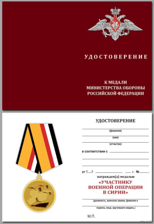 Медаль «Участнику военной операции в Сирии» является одной из восьми ведомственных наград Министерства обороны Российской Федерации. Она учреждена приказом Министра обороны РФ от 30 ноября 2015 года и предназначена для награждения военнослужащих и лиц гражданского персонала ВС РФ, отличившихся при выполнении задач военной операции в Сирийской Арабской Республике.