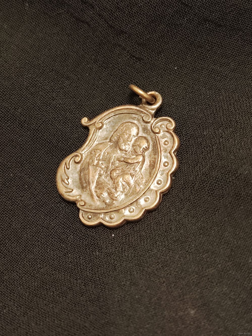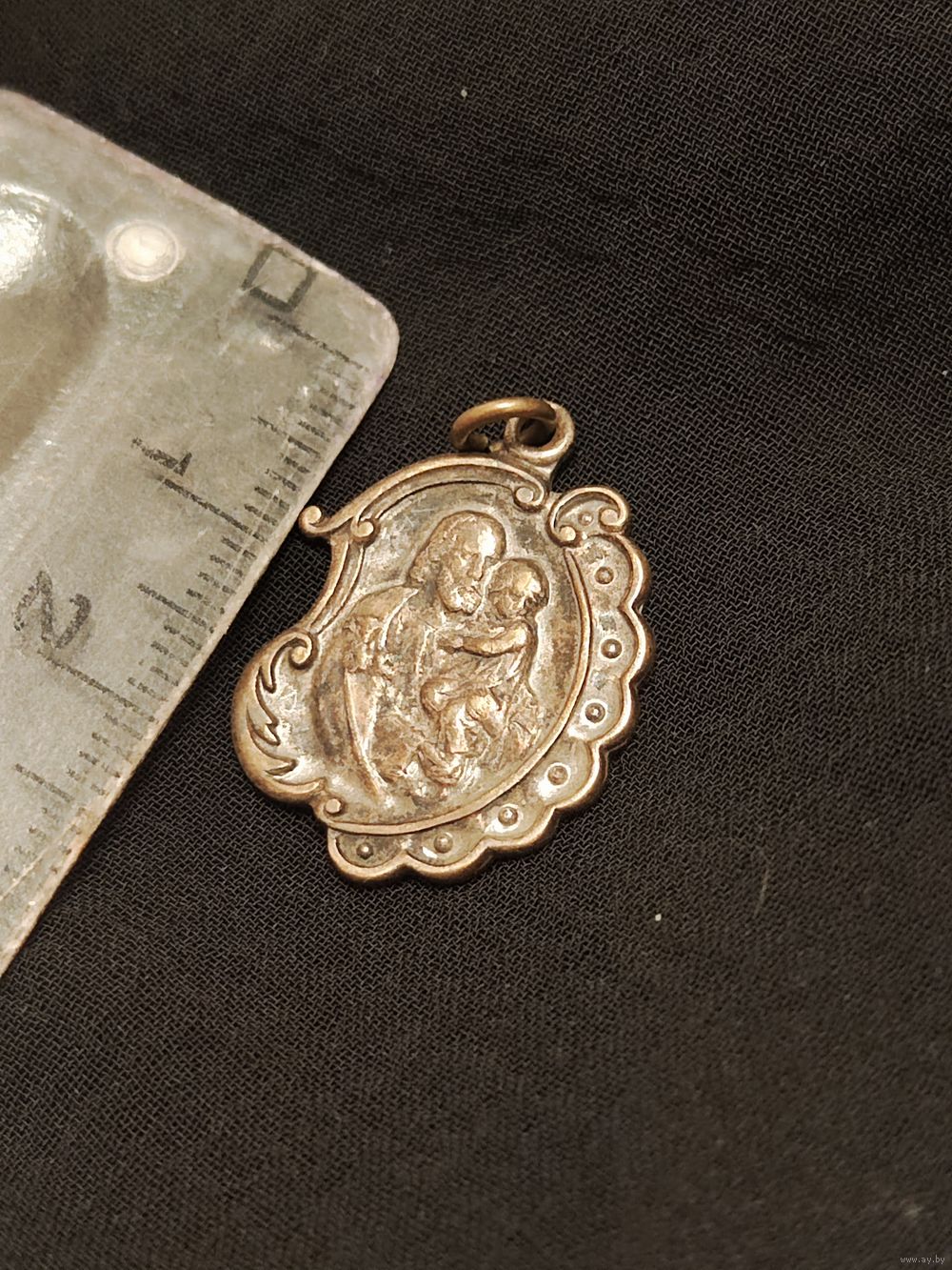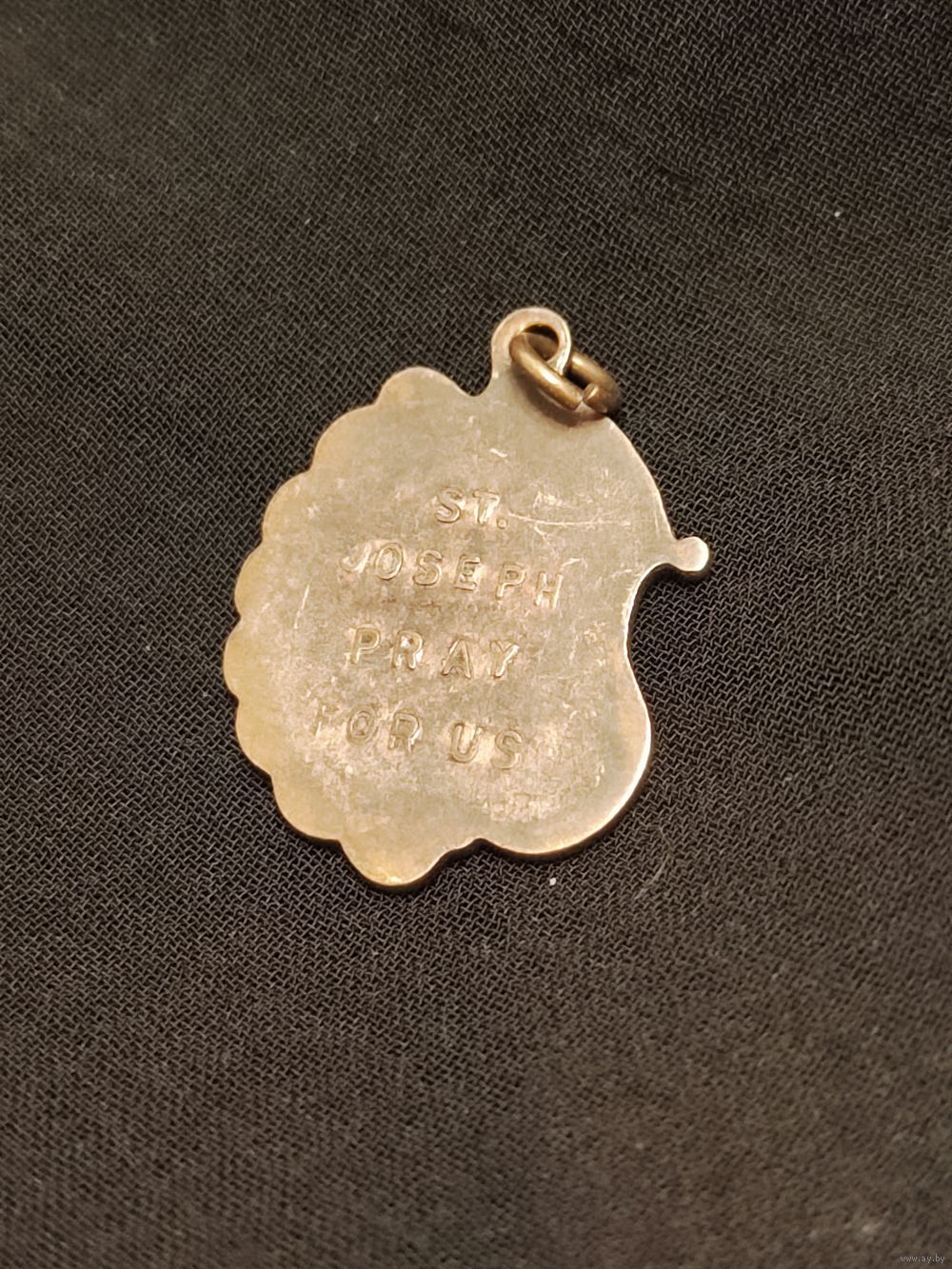 Старый медальон с одной стороны изображение Святого Иосифа с обратной надпись Святой Иосиф молись о нас