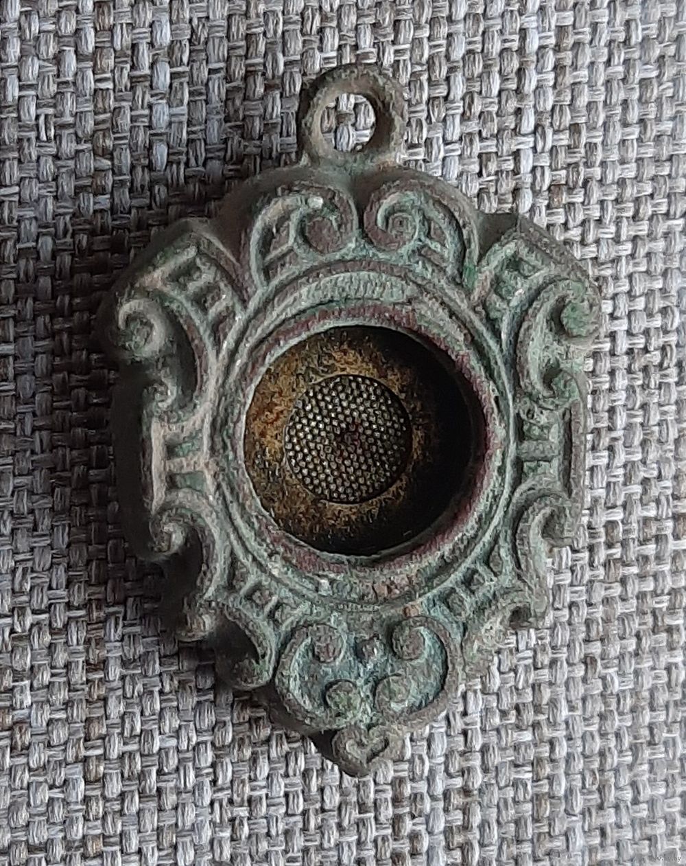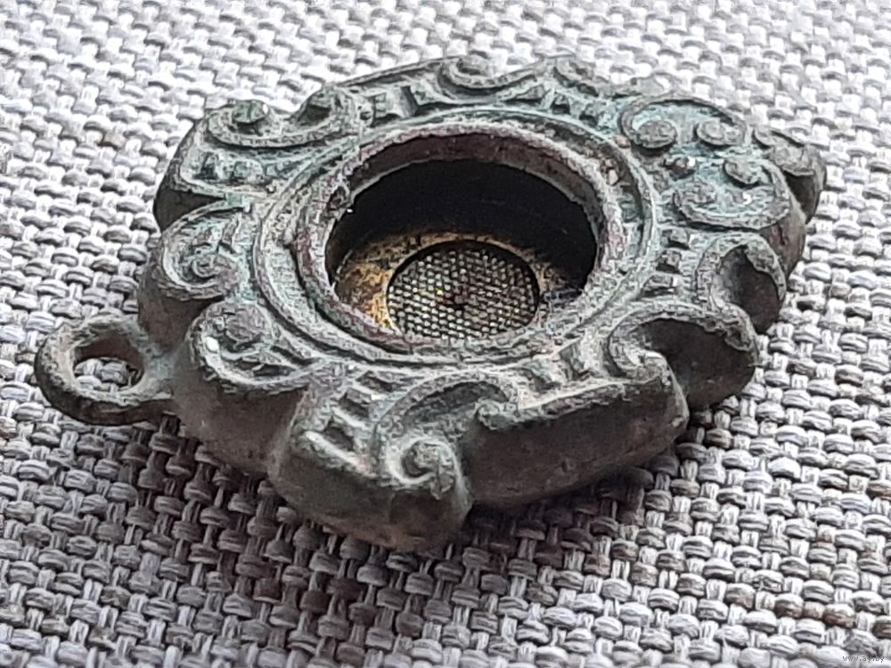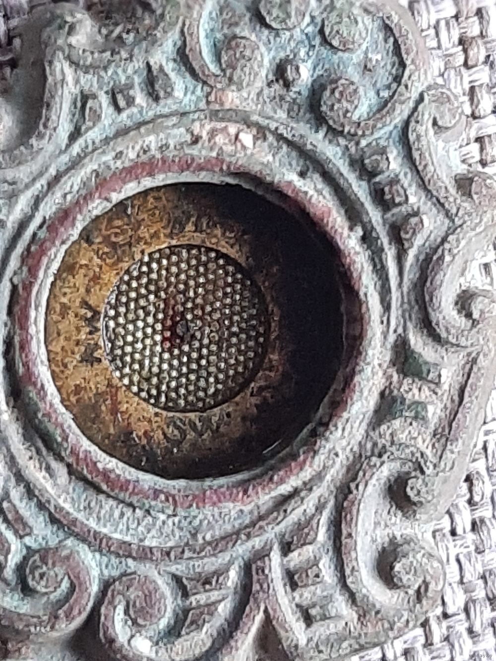 | Определяйте самостоятельно по фото, не вскрывался, внутри круга видны остатки надписи, остатки позолоты и серебрения. | |