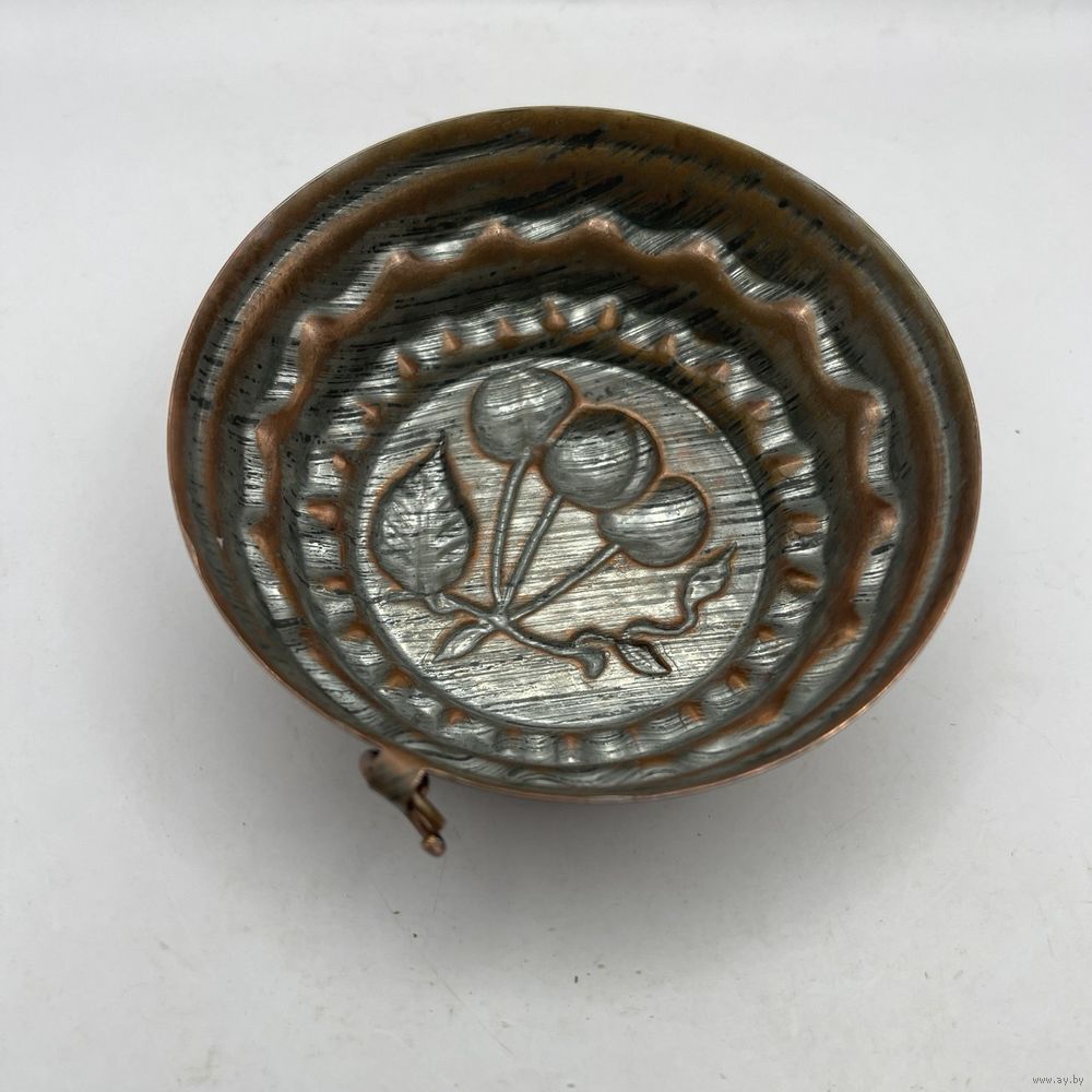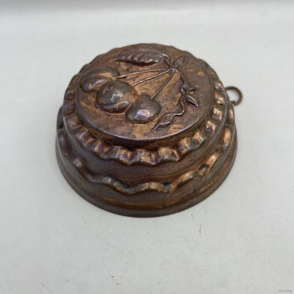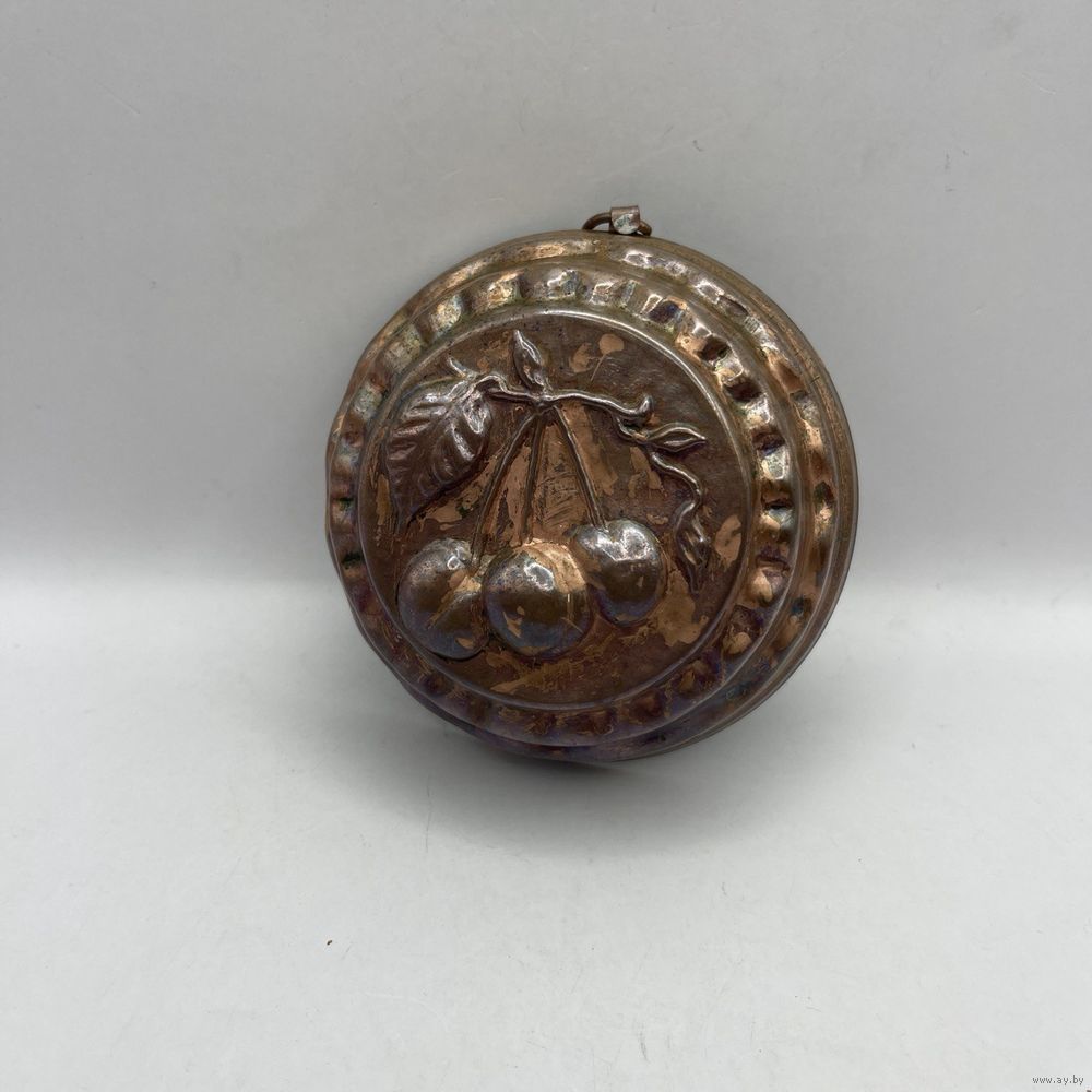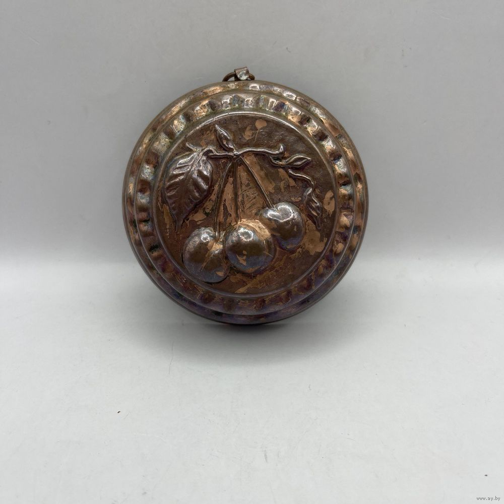 Винтажная медная форма для выпечки, панно с объемным изображением вишневой ветки с ягодами. С кольцом для использования в качестве настенного декора. Италия. 1970-е г.г. Диаметр 10,5 см, глубина 4,5 см. Естественная патина снаружи.