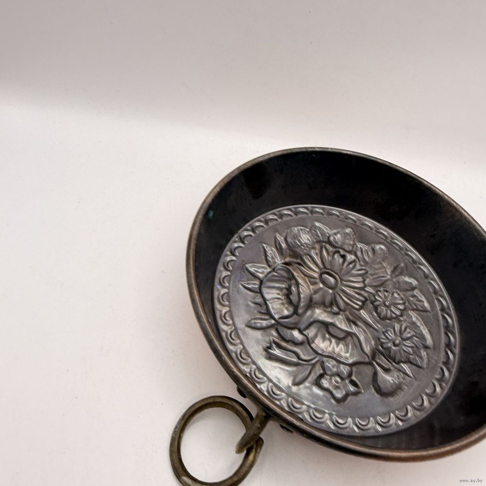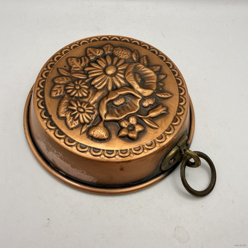 Винтажная медная форма для выпечки с объемным изображением полевых цветов ручной работы на дне. С оловянным лужением внутри. Латунное кольцо для настенного хранения и использования в качестве панно. Италия. Диаметр 13,5 см, глубина 3,5 см. Естественная патина.