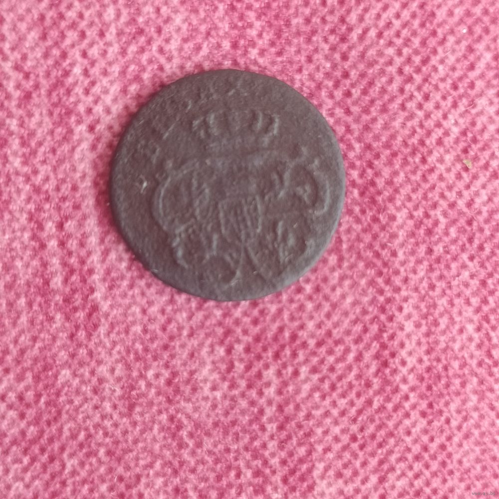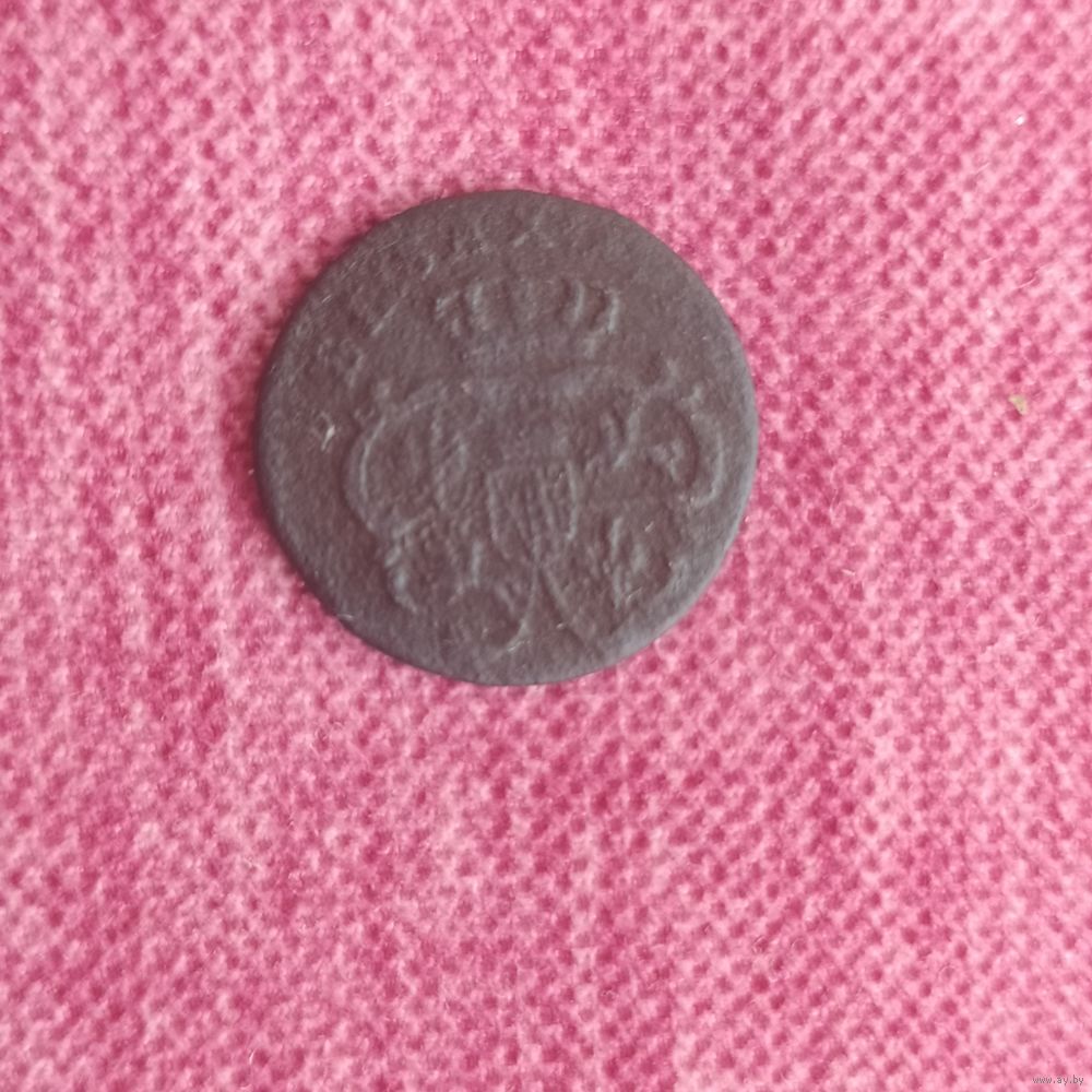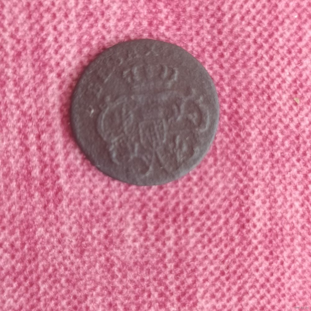 Медная монета: Коронный шеляг (солид) Августа III (1753–1755) является редким (по косвенным признакам) представителем медных солидов XVIII, находка, оригинал, не чищен..см.фото, спасибо.
