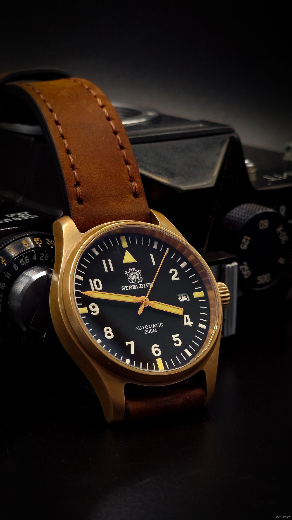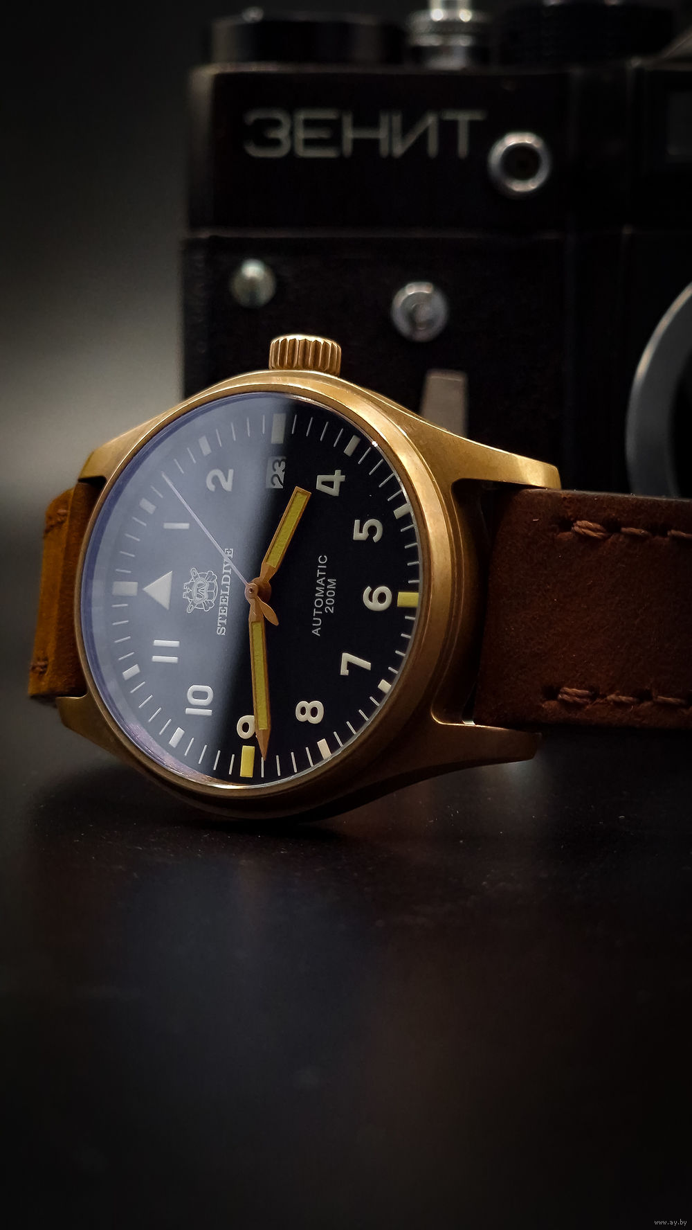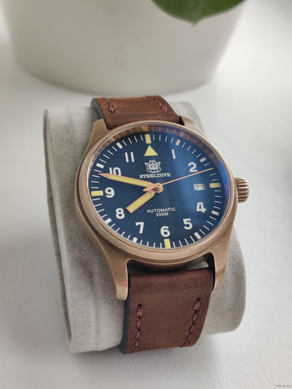Бронзовые механические часы с автоподзаводом "STEELDIVE" дайверские 200м. С новым шикарным из натуральной кожы ремнём. Сапфировое стекло.