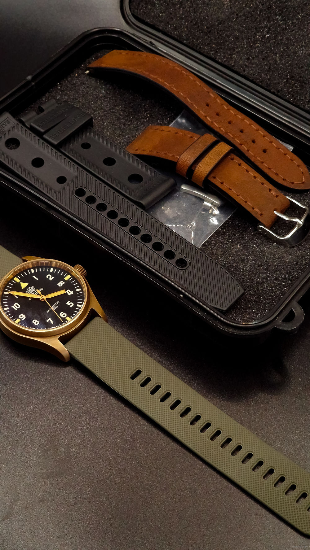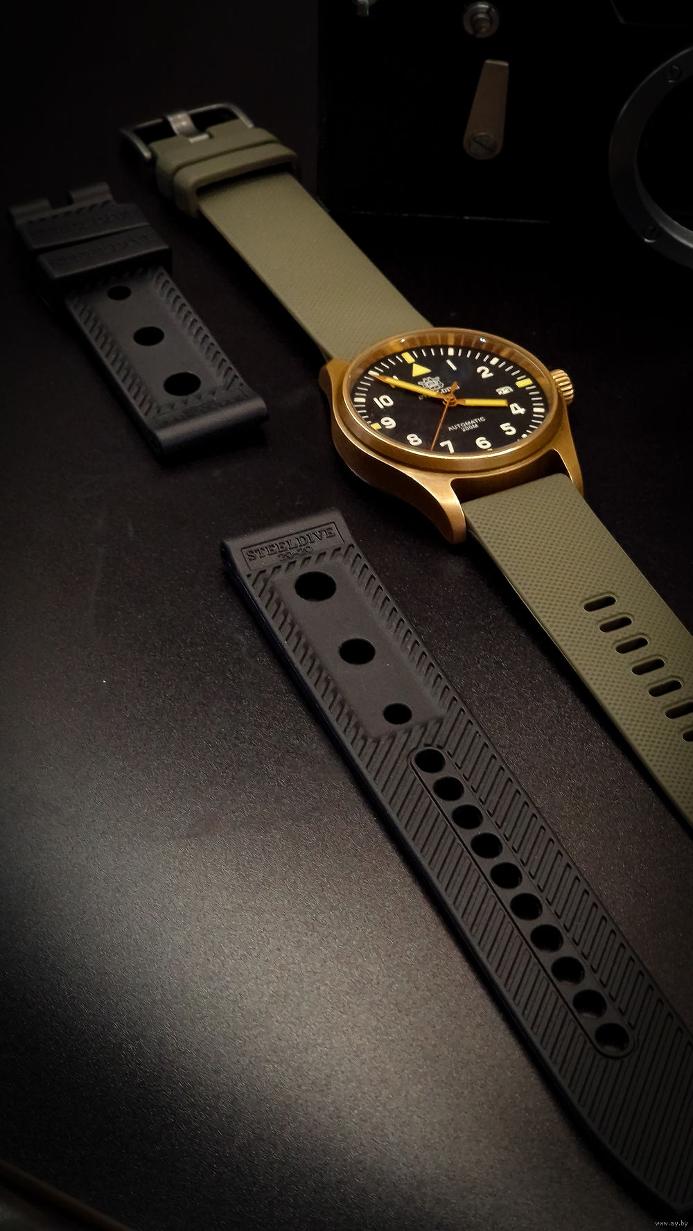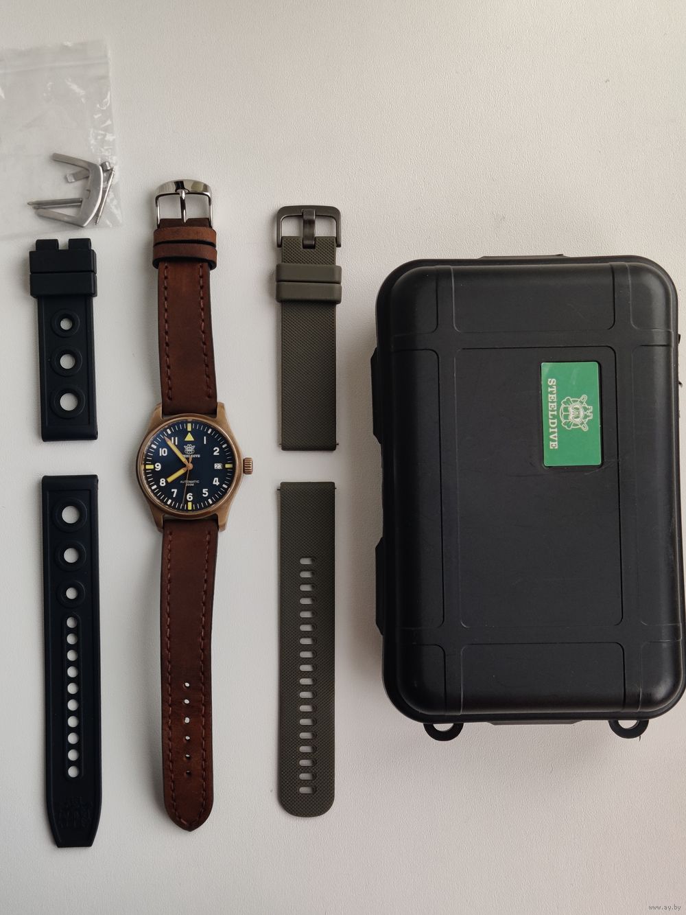 В комплекте: коробка, оригинальный черный силиконовый ремень, а так же оливковый силиконовый ремень на быстросъёмных шпильках.