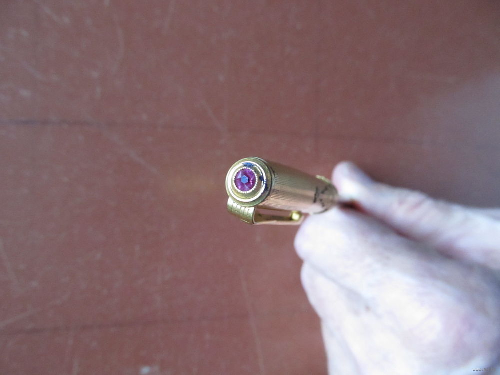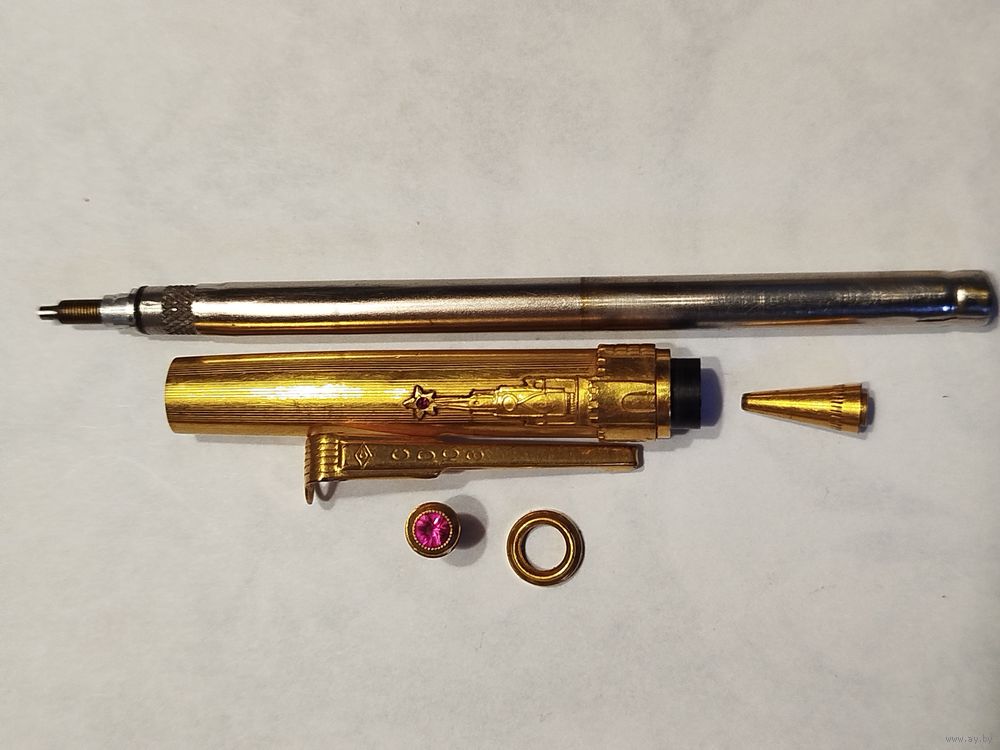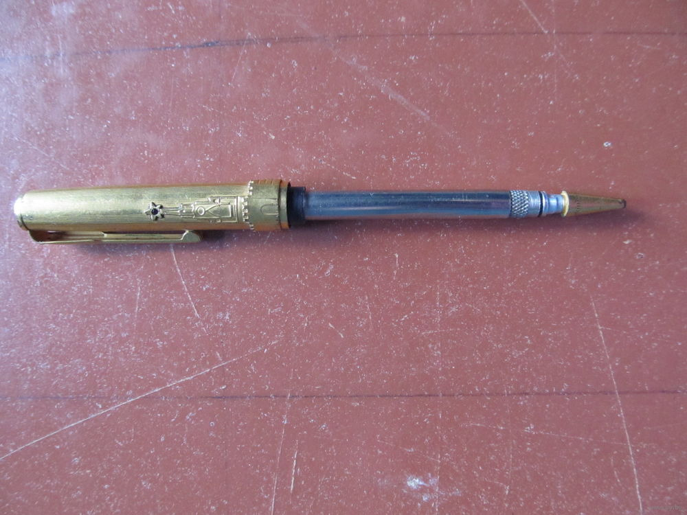 Выпускался в 50-е и 60-е годы прошлого века. Навершие "крышки" карандаша украшает вставка с рубином. Выпускались наборы как с настоящими, так и с искусственными рубинами. Какие рубины в данном карандаше (а их два, второй - в звезде кремлевской башни) определить без специальной экспертизы не представляется возможным. "Крышка" карандаша изготовлена из латуни с позолотой и имеет накладное украшение в виде Спасской башни и кольца стилизованной кремлевской стены. Наконечник карандаша с резьбой изготовлен из латуни с позолотой и имеет как мелкую, так и крупную насечку.