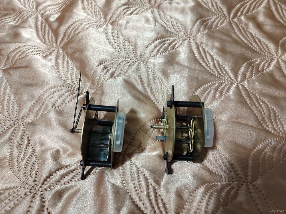 Примечание: для механизма со стрелками после полной остановки завода может потребоваться ручной запуск маятника. (То есть лучше подзаводить не дожидаясь полной остановки) (это можно исправить, если знать, как смазывать такой механизм). Второй механизм - без стрелок, запускается сам при заводе.