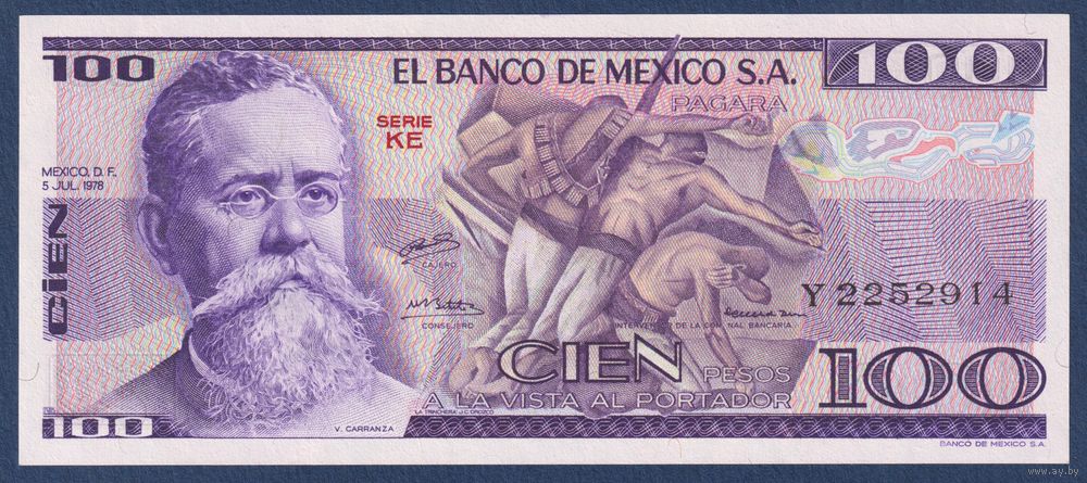 Мексика, 100 песо 1978 г, P-68a (KE, президент Венустиано Карранса), UNC
