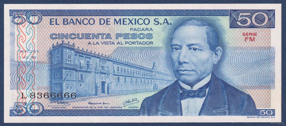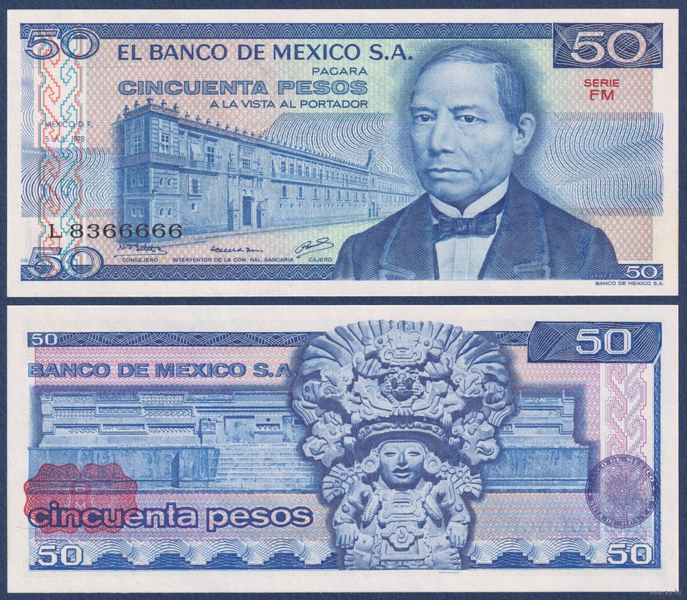 Мексика, 50 песо 1978 г., P-67a(4) (FM, президент Бенито Хуарес, номер!), UNC