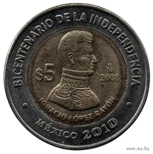 МЕКСИКАНСКИЕ СОЕДИНЁННЫЕ ШТАТЫ. 5 ПЕСО 2008. Игнасио Лопес Район. Двухсотлетие независимости. БИМЕТАЛЛ