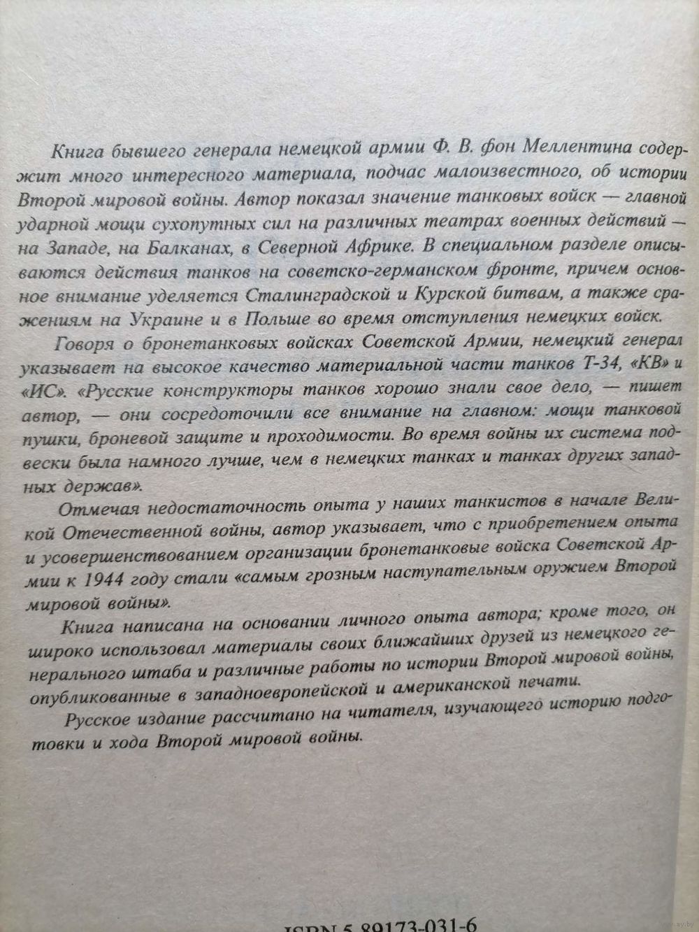 Книга бывшего генерала немецкой армии Ф. В. фон Меллентина содержит много интересного материала, подчас малоизвестного, об истории Второй мировой войны. Автор показал значение танковых войск - главной ударной мощи сухопутных сил на различных театрах военных действий - на Западе, на Балканах, в Северной Африке. В специальном разделе описываются действия танков на советско-германском фронте, причем основное внимание уделяется Сталинградской и Курской битвам, а также сражениям на Украине и в Польше во время отступления немецких войск. Книга написана на основании личного опыта автора; кроме того, он широко использовал материалы своих ближайших друзей из немецкого генерального штаба и различные работы по истории Второй мировой войны, опубликованные в западноевропейской и американской печати. Русское издание расчитано на читателя, изучающего историю подготовки и хода Второй мировой войны.