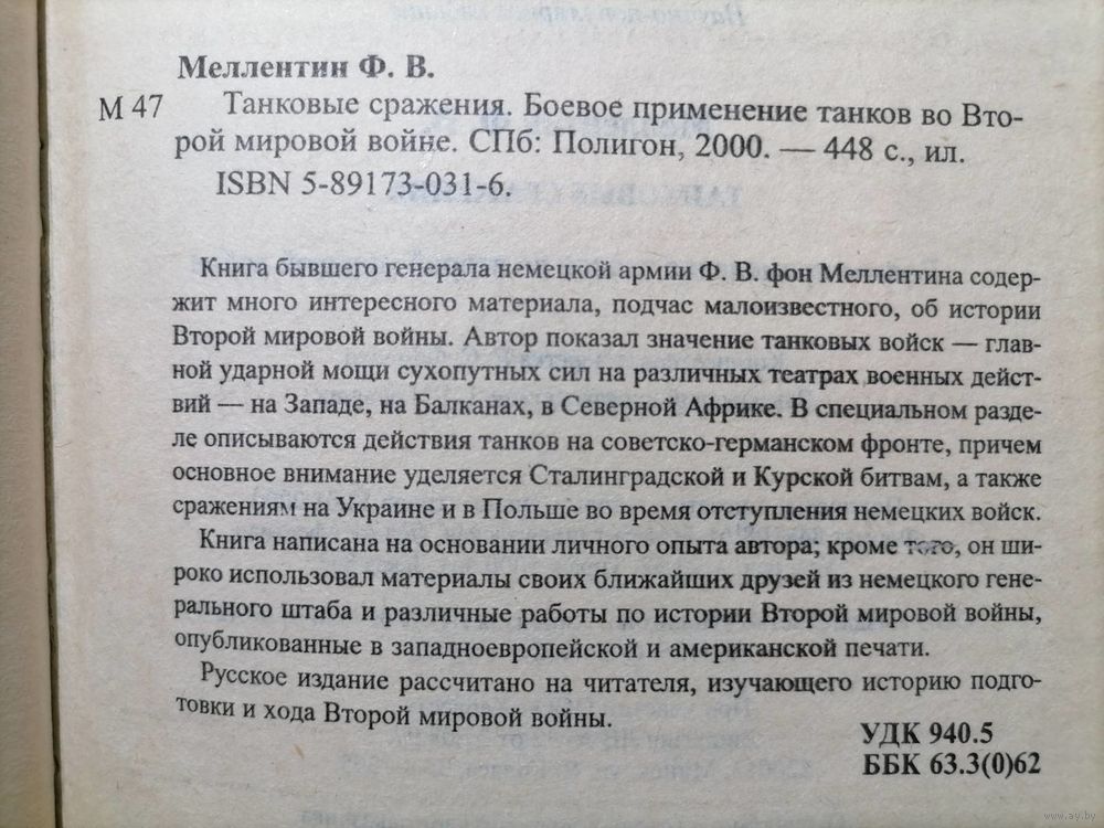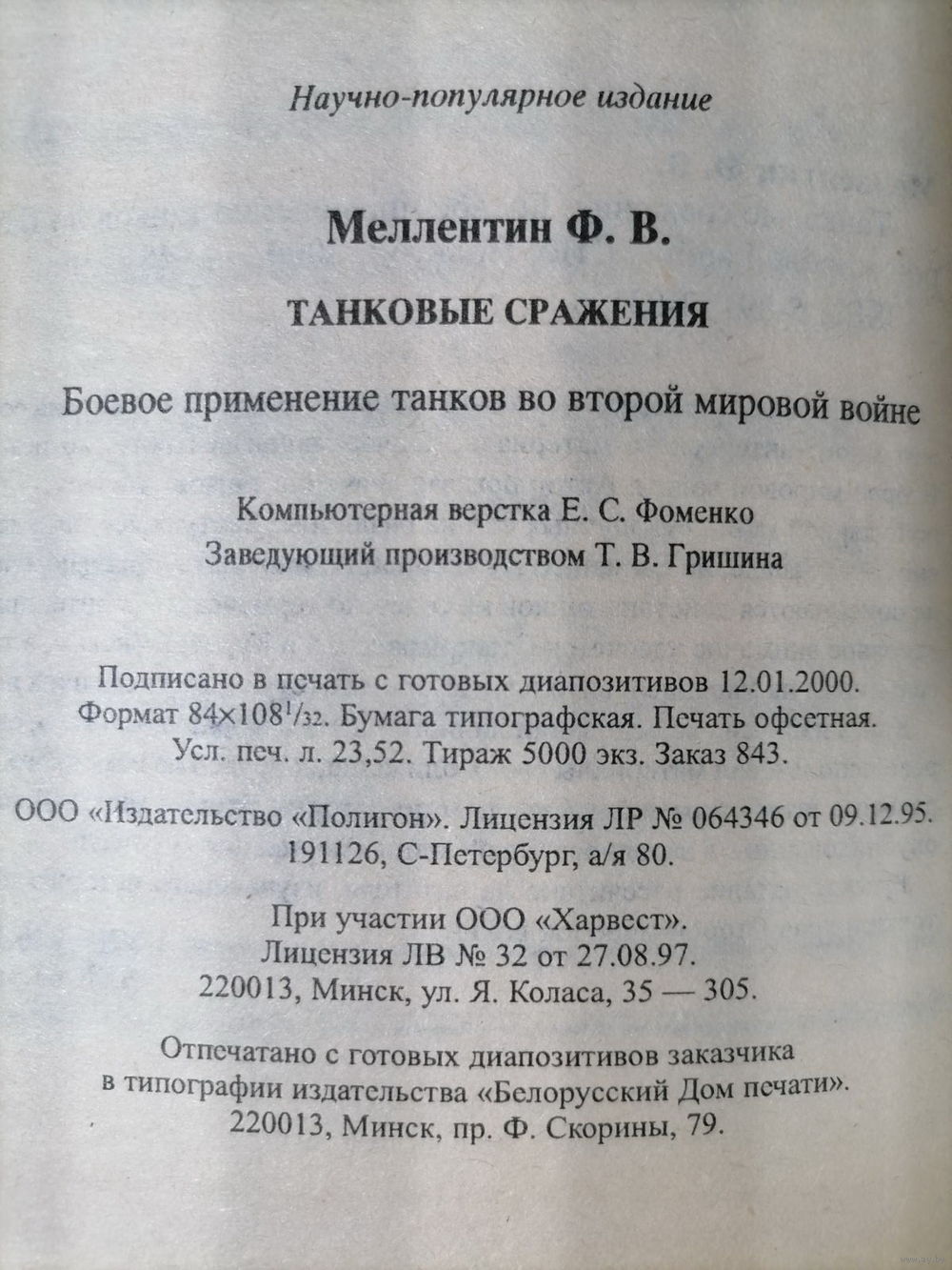 2. Танковые сражения: боевое применение танков во Второй мировой войне: пер. с англ. / Ф.В. Меллентин. – Санкт-Петербург ; Москва: Полигон; Москва: АСТ, 2000. – 448 с.
