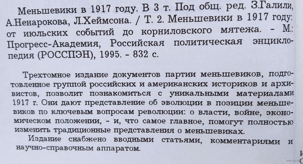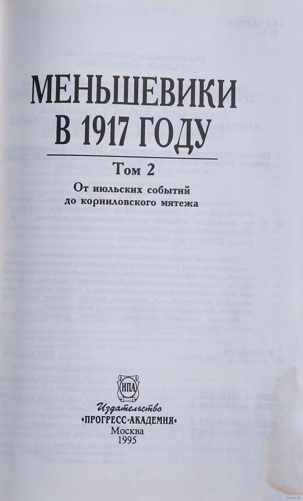 Меньшевики в 1917 году. В 3 тт. Т. 2. Меньшевики в 1917 году: от июльских событий до корниловского мятежа Под общ. ред. З. Галили, А. Ненарокова, Л. Хеймсона. М. РОССПЭН, Прогресс-Академия 1995г. 832 с. Твердый переплет,
