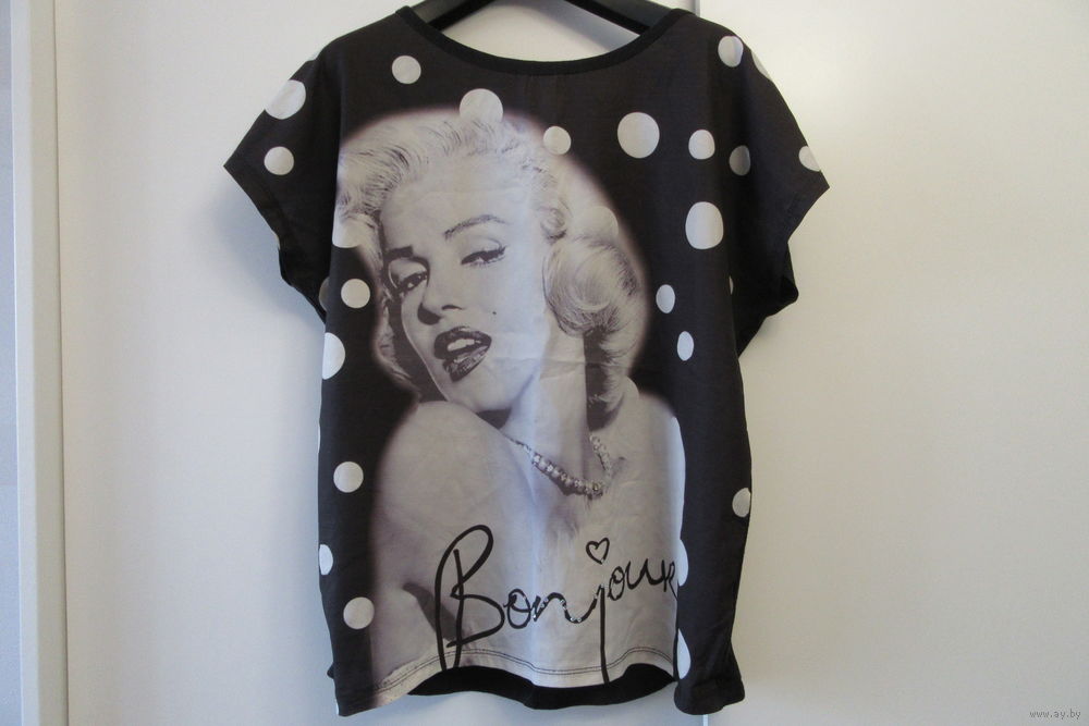 Черная майка - блузка в белый горох, рисунок, принт Мерлин Монро! Знаменитость, известные люди.