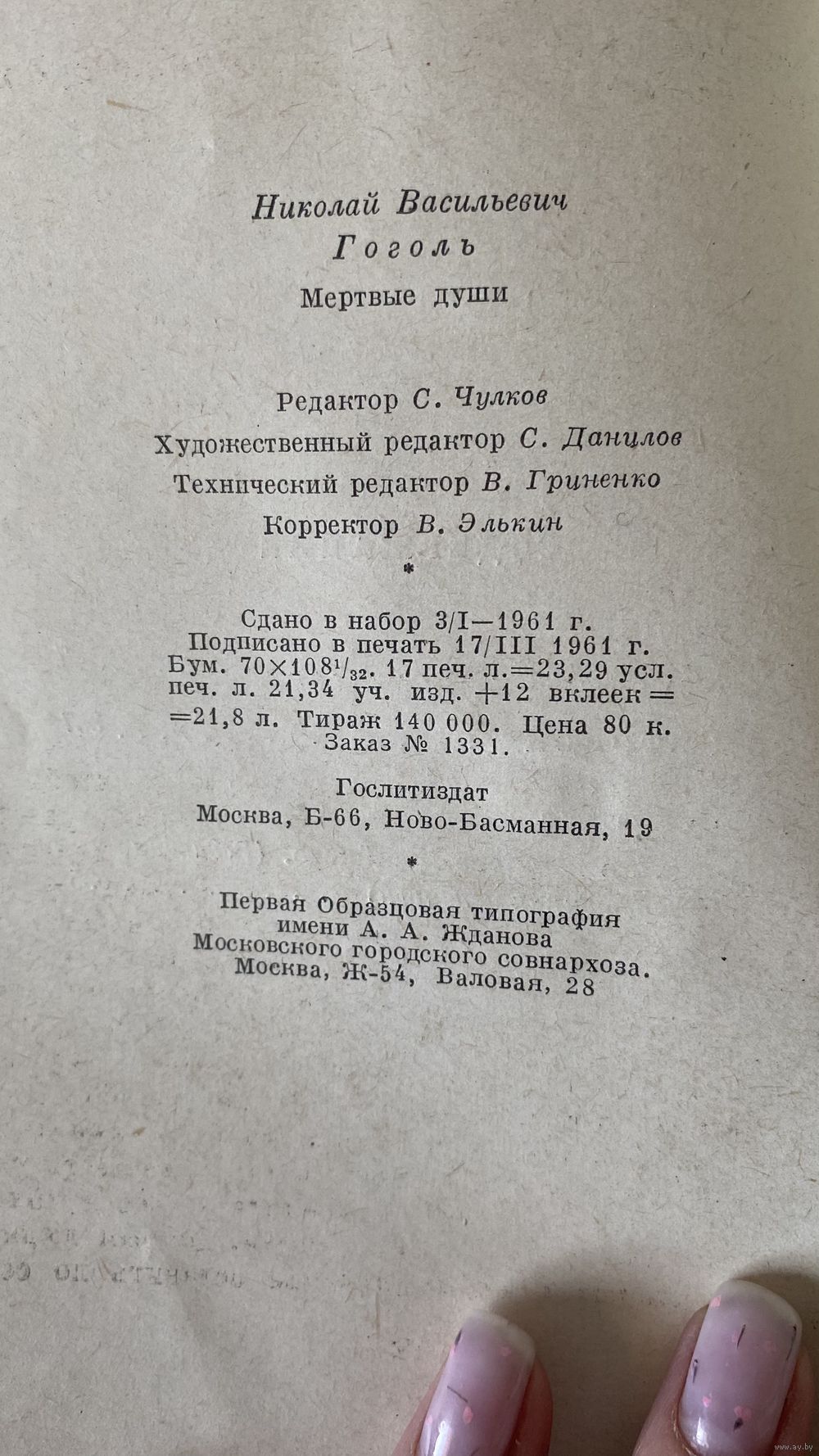 Книга «Мертвые души» 1961 года в твердом переплете. Тираж 140 000 штук. В хорошем состоянии, немного подклеен корешок
