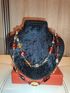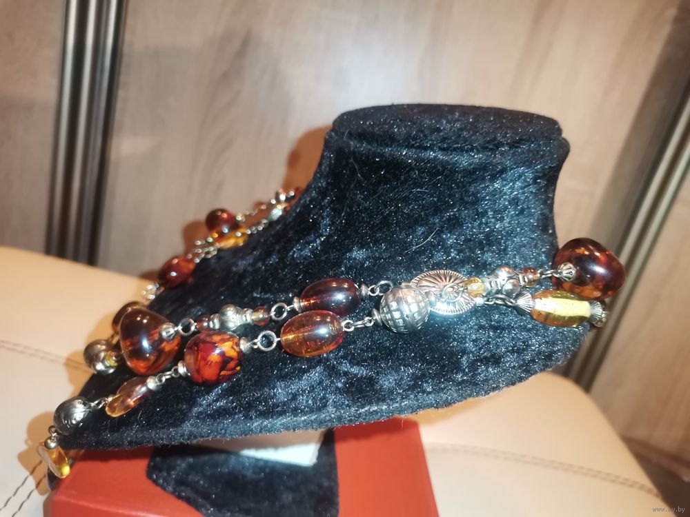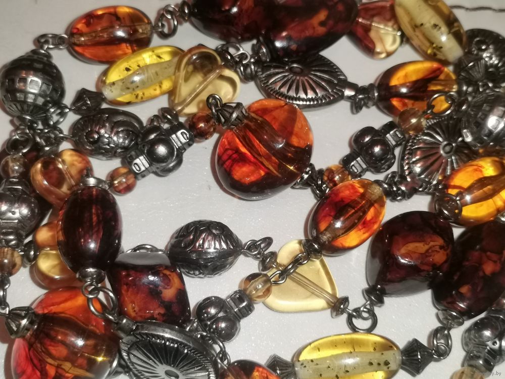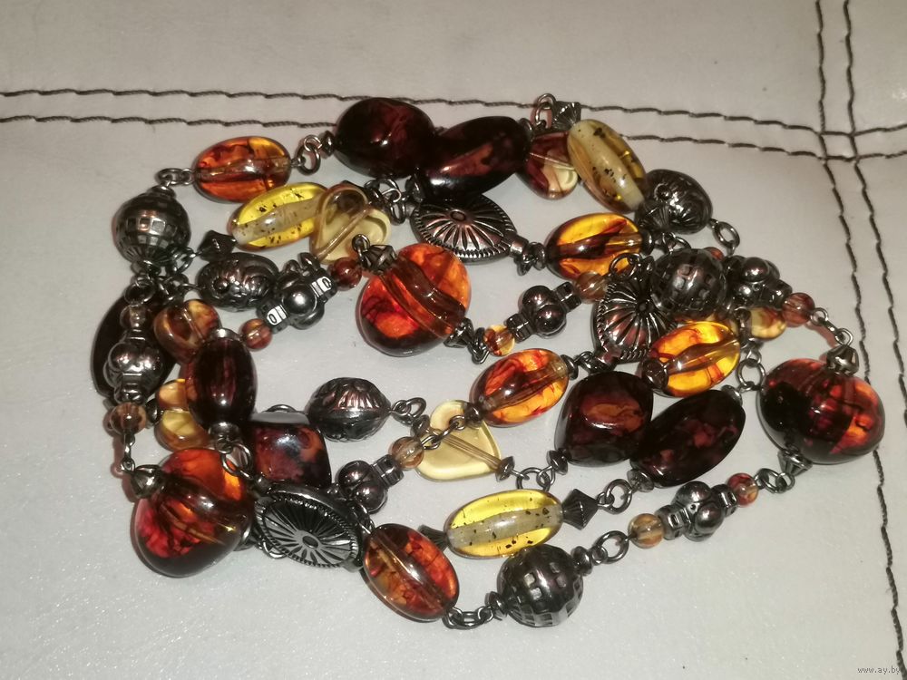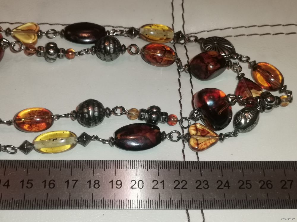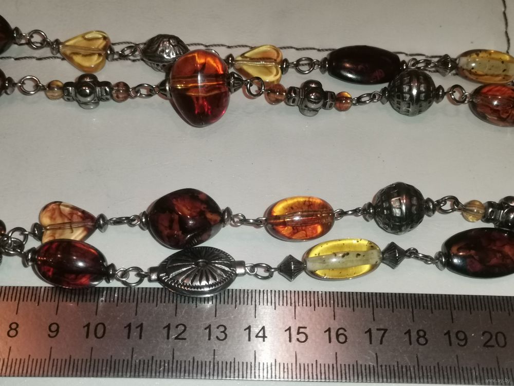 Металлические бусы с пластиковыми вставками под янтарь, длина 116 см.