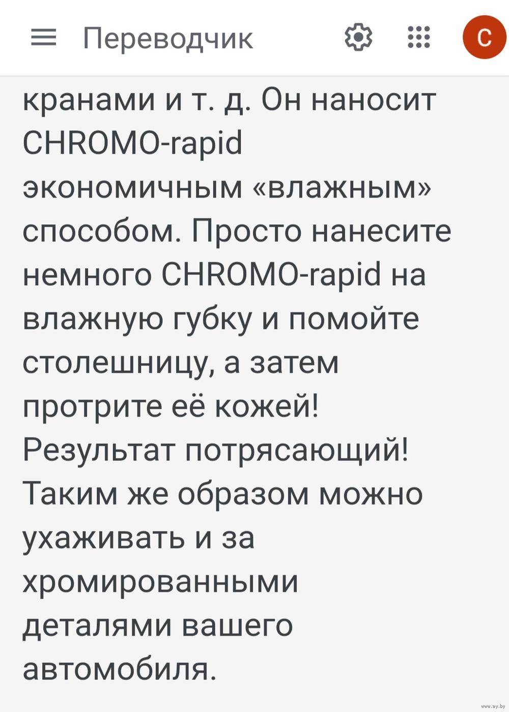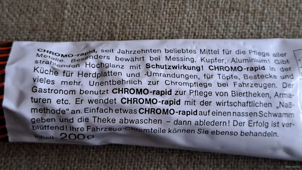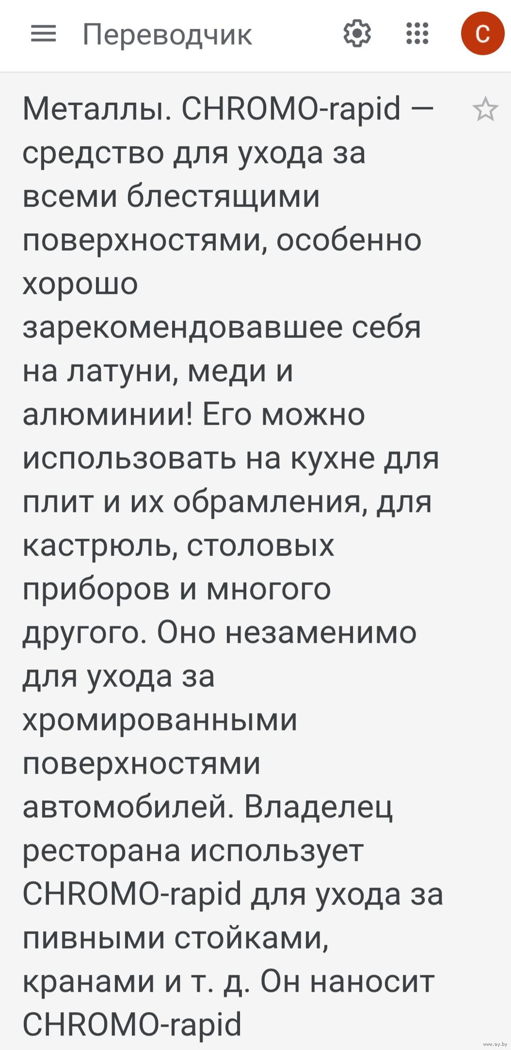 Металлы. CHROMO-rapid средство ухода за всеми блестящими поверхностями, особенно латунь, медь, алюминий. Кухня. Автомобиль. Бар / Ресторан. Индустрия. Полная инструкция, см. фото 4, 5. Мировой бренд, производство Германия.