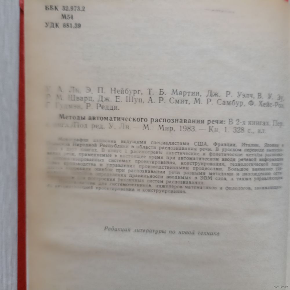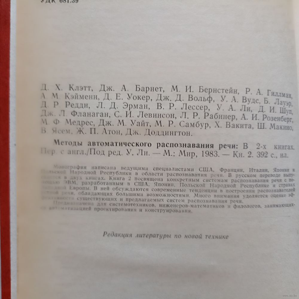 В книге 1 рассмотрены акустические и фонетические методы распознавания речи, применяемые в настоящее время при автоматическом вводе речевой информации в автоматизированных системах проектирования, конструирования, технологической подготовки производства и управления производственными процессами. Большое внимание уделено коррекции ошибок при распознавании речи разными методами и нахождению оптимальных способов определения правильности вводимых в ЭВМ слов, а также управляющим структурам для построения различных систем распознавания. Книга 2 посвящена конкретным системам распознавания речи с помощью ЭВМ, разработанным в США, Японии, ПНР и странах Западной Европы. Обсуждаются современные тенденции в построении распознавания устной речи, обладающих большими возможностями. Много внимания уделяется оценке эффективности существующих и предлагаемых систем распознавания речи. Для системотехников, инженеров-математиков и филологов, занимающихся автоматизацией проектирования и конструирования.