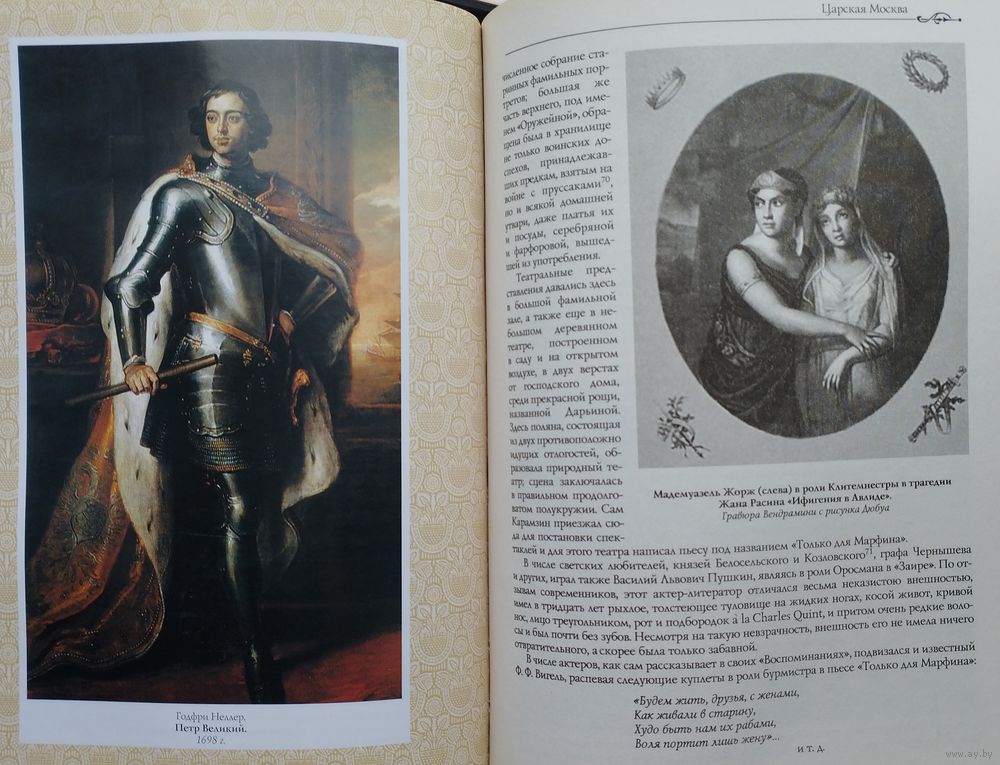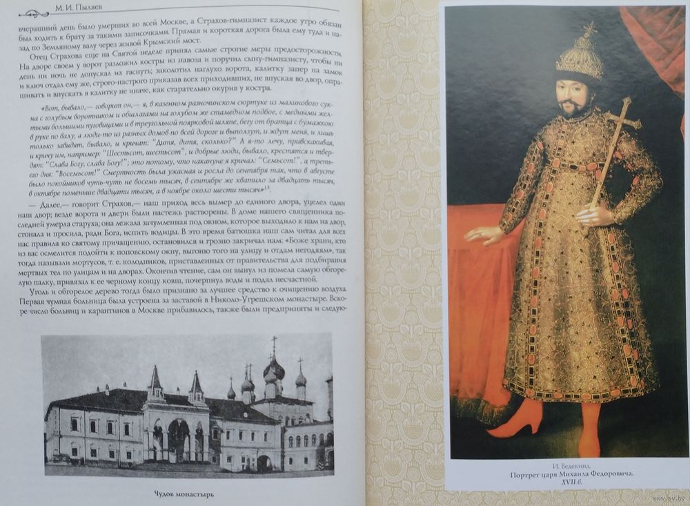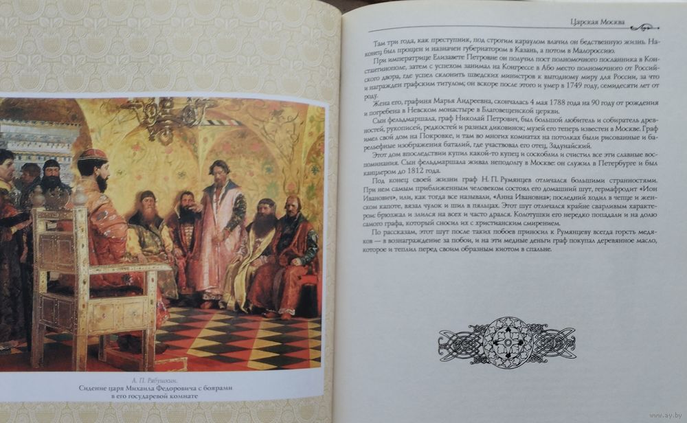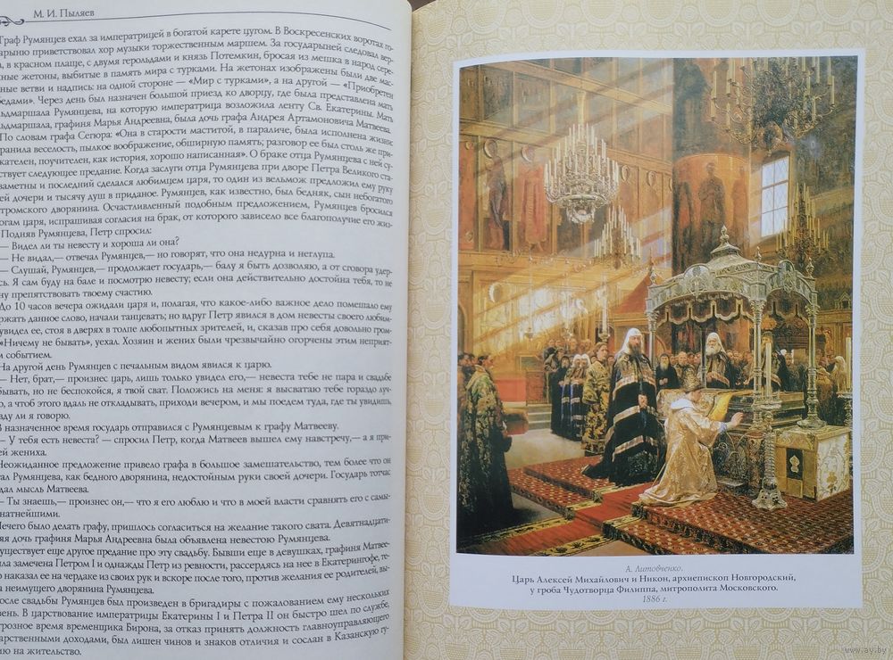 Подарочное издание. Большой энциклопедический формат. Ляссе. Тираж 4100 экз. 480 стр. «Царская Москва» — произведение известного русского литератора Михаила Ивановича Пыляева (1842—1899), знатока российской старины, автора многочисленных журнальных публикаций и отдельных изданий, увидевших свет во второй половине XIX века. Собранные им сведения и прекрасное иллюстративное оформление сделали книгу признанным памятником событиям жизни города эпохи XVIII — начала XIX веков и связанным с ними историческим лицам. Время работы Пыляева над книгой совпало с ростом в российском обществе интереса к отечественной истории вообще и истории Москвы в частности. Источниками для его книги служили публикации в исторической периодике («Исторический вестник», «Русская старина», «Русский архив»), в выпусках «Чтений в Обществе истории и древностей российских при Московском университете», изданные П. И. Бартеневым материалы частных архивов, труды известных историков — бытописателя И. Е. Забелина, москвоведа И. М. Снегирёв и других. Пыляев ссылался не только на фундаментальные работы по общей истории России В. Н. Татищева, Н. М. Карамзина, Н. И. Костомарова, М. П. Погодина и других, но и на заметки посещавших Россию иностранцев, на мемуары и биографии исторических личностей[1]. В отличие от историко-архитектурного описания городских памятников в связи с основными событиями русской истории, характерного для вышедших к тому времени путеводителей по Москве", Пыляев делал акцент на живой истории древней столицы «в лицах, в занимательной форме изобразив быт и нравы её обитателей». Пыляев, как скрупулёзный «репортёр минувшего», осознанно подбирал такие факты повседневной жизни прошлых эпох, которые ускользали от внимания профессиональных историков и позволяли воссоздавать минувшие события в непривычном для них ракурсе. В авторской преамбуле к первому изданию сам М. И. Пыляев писал: «Я не имел в виду написать полную историю Москвы, а лишь собрать здесь устные сказания современников и те сведения о ней, которые рассеяны в русских и иностранных сочинениях и которые рисуют преимущественно быт и нравы первопрестольной столицы в прошлом и начале нынешнего столетия».