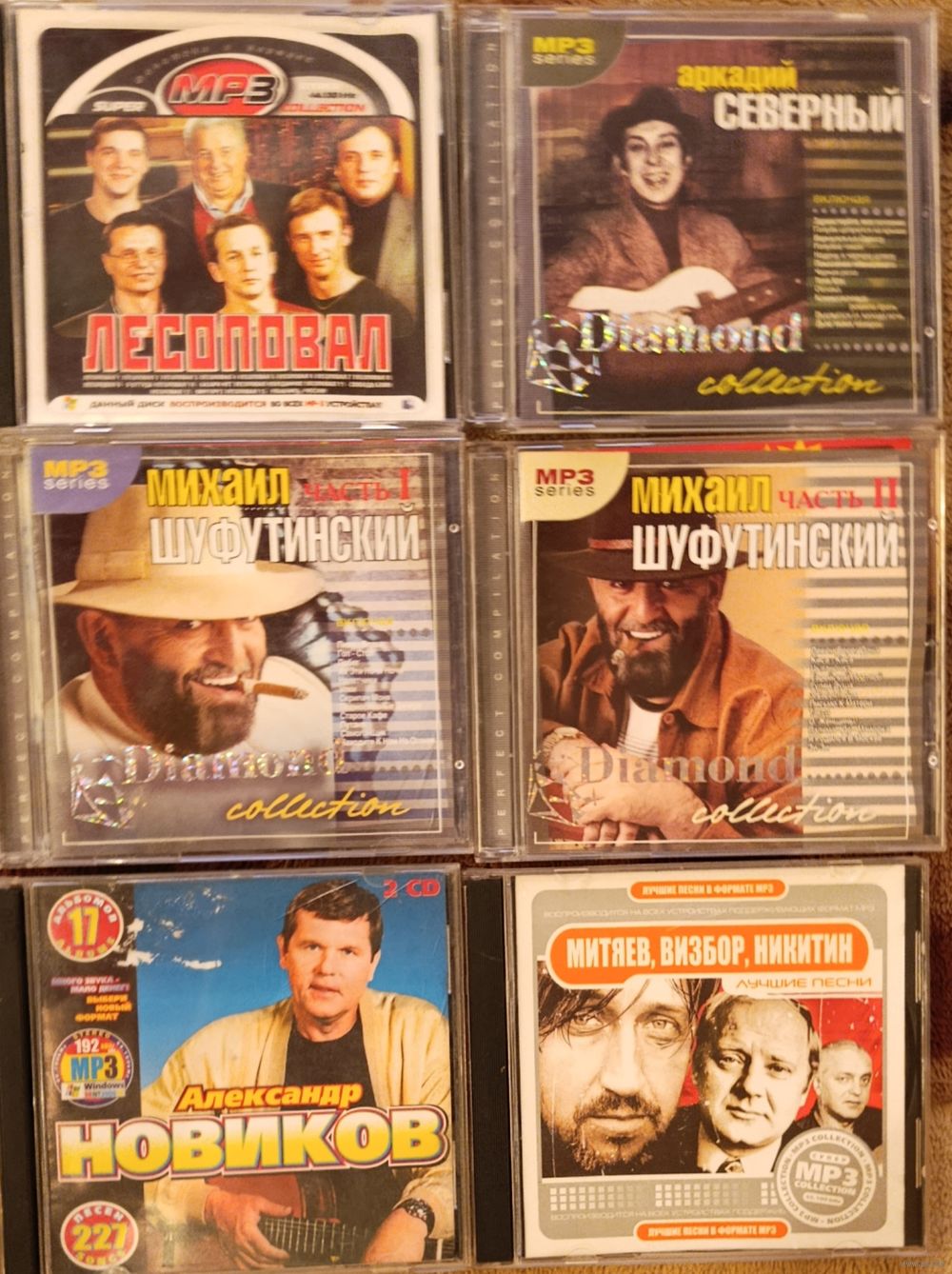 Михаил Шуфутинский, Аркадий Северный, Александр Новиков, Лесоповал, Олег Митяев, Юрий Визбор, Татьяна и Сергей Никитины на дисках в MP3 формате. Цена за один диск
