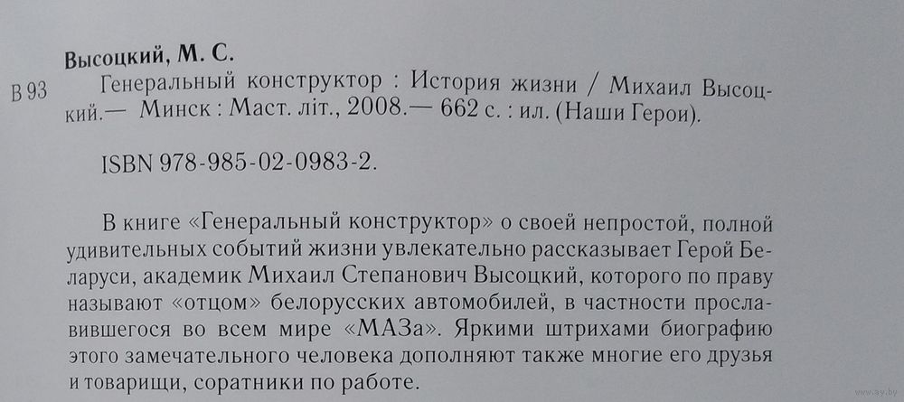 Михаил Высоцкий. Генеральный конструктор: история жизни. (Наши Герои) Минск : Мастацкая лiтаратура, 2008. - 661 c. Твердый переплет. Увел.формат. Суперобложка