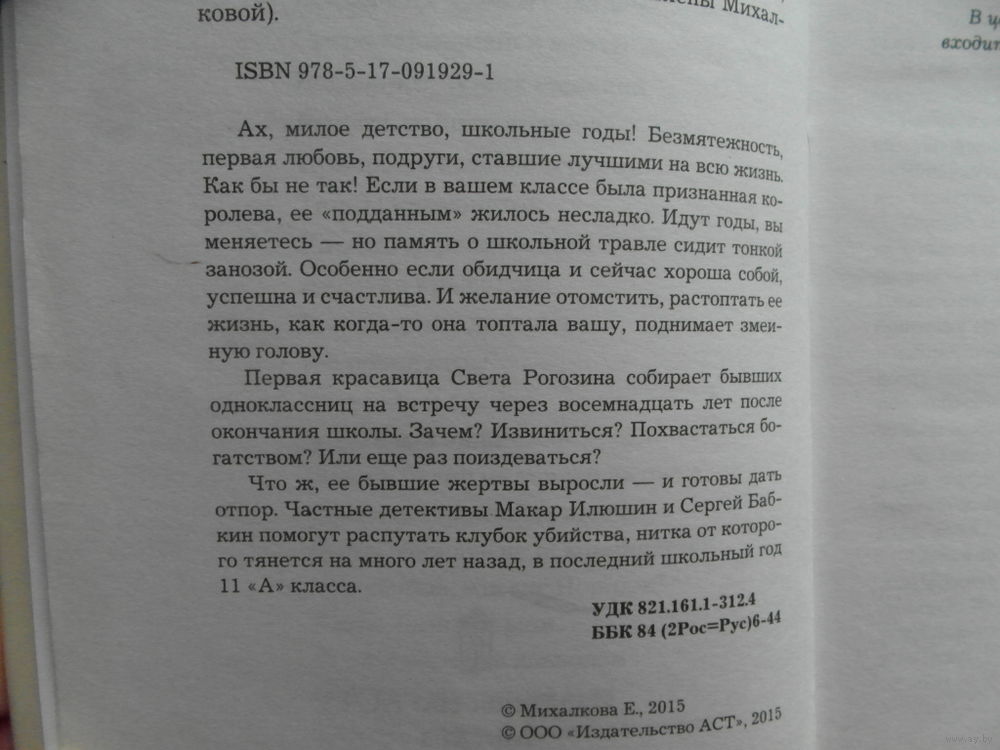 - Захватывающий детектив на тему школьного буллинга. Щекотливое дело в тандеме сыщиков Илюшина и Бабкина. Неужели школьная обида может быть настолько глубока, что толкает на убийство? - От одной из самых экранизируемых писательниц. Общий тираж книг автора превысил 1 000 000 экземпляров, снято около 20 экранизаций. Ах, школа! Первая любовь, лучшие подруги, беззаботность, лето. Впрочем, как бы не так. Всем, в чьем классе была «королева», понимают, как несладко живется тем, кто не попал в «свиту». Впрочем, время лечит: годы идут, обиды забываются. Или нет? Неужели желание отомстить, растоптать, унизить живет в сердце и спустя много лет? Света Рогозина, самая красивая девочка в школе, собирает бывших одноклассниц на встречу. Зачем? Попросить прощения? Похвастаться деньгами? Снова поиздеваться? Проблема в том, что ее бывшие жертвы уже взрослые и готовы дать отпор. Частные сыщики Макар Илюшин и Сергей Бабкин берутся за убийство, ниточки от которого тянутся в прошлое, туда, где оканчивали школу ученики 11 «А» класса. Состояние твердо хорошее.