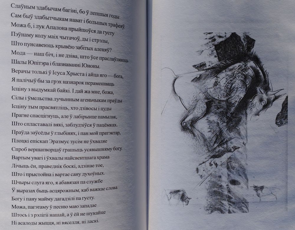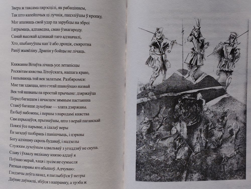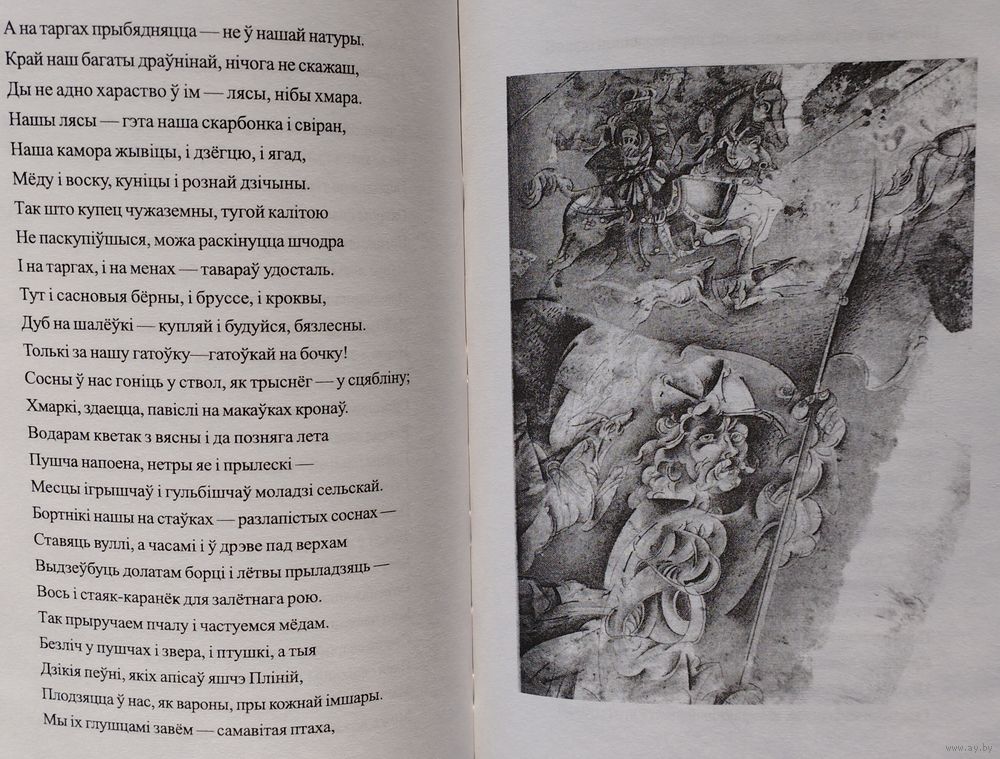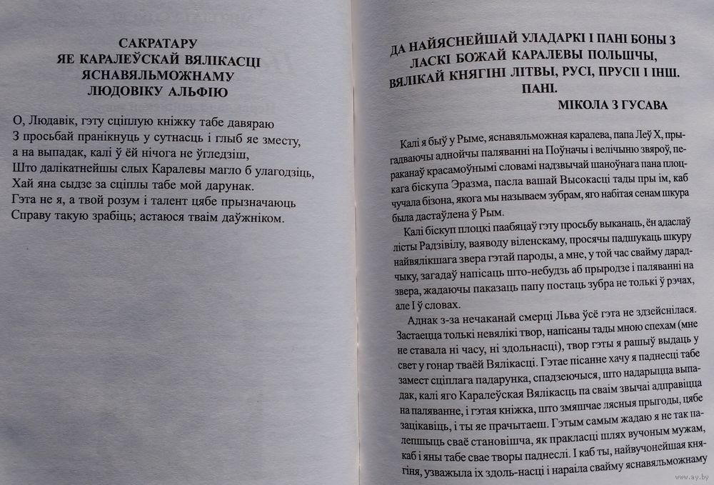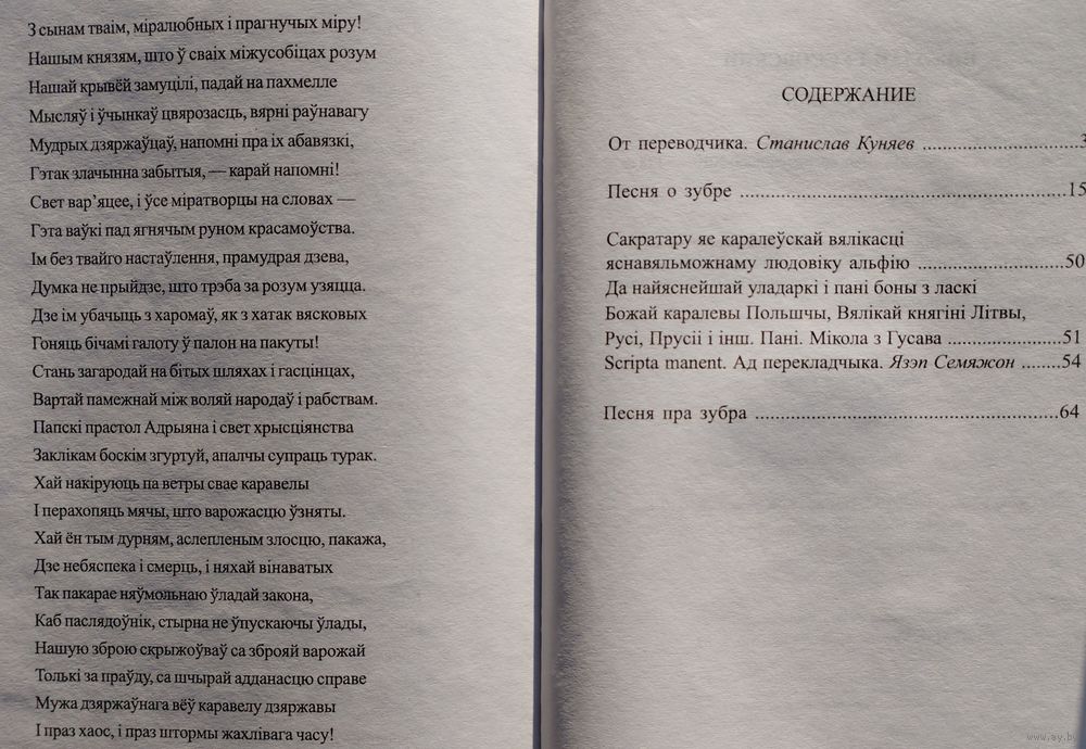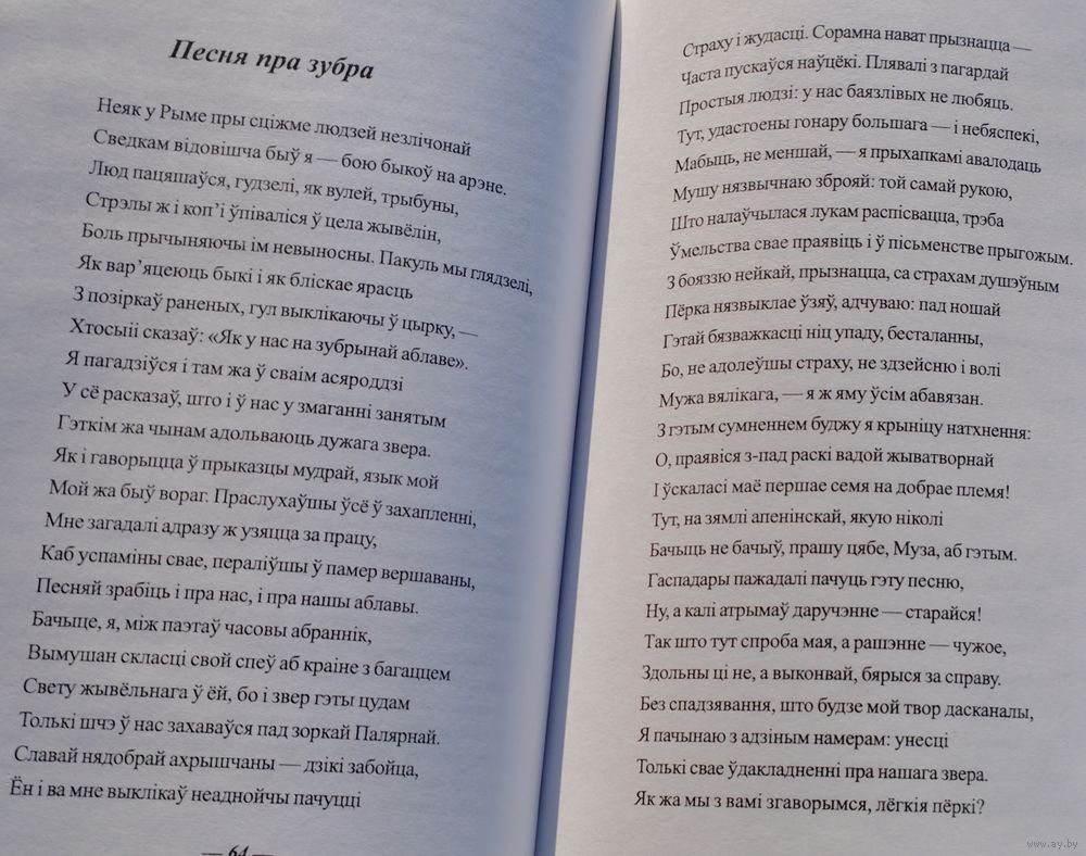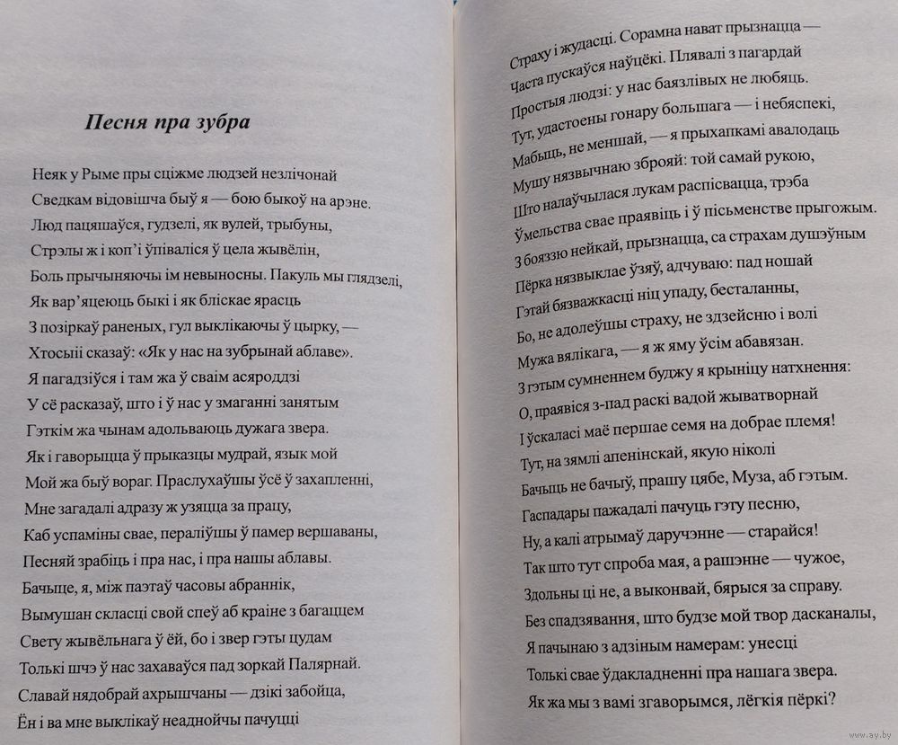 Большой энциклопедический формат. Тираж 1000 экз. 128 стр. Перевод с лат. яз. На рус. и бел. яз. Иллюстрации У. П. Савича. «Песня про зубра» (лат. Carmen de statura feritate ac venatione bisontis, в переводе «Песнь о мощи, дикости зубра и охоте на него» - латинская поэма Николая Гусовского, поэта раннего Ренессанса, жившего и творившего на территории Великого княжества Литовского и Польского королевства. Впервые поэма была издана в Кракове в 1523 году в составе сборника, состоящего из одноимённой поэмы, 11 стихотворений и прозаического посвящения королеве Боне Сфорца. Язык оригинала поэмы - латинский; Дата написания - 1522 г.; Дата первой публикации - 1523 г. Поэма считается непревзойдённой в эпическом показе Беларуси и белорусского народа. В поэме ярко прослеживается патриотический призыв к объединению и дружбе разных по вере и культуре европейских народов перед угрозой иностранного нашествия. Николай Радзивилл, виленский воевода, предполагал направить в подарок Льву X чучело зубра. В связи с этим Николай Гусовский должен был написать некое «приложение» к этому необычному подарку — поэму «Carmen de statura feritate ac venatione Bisontis», которая ныне более известна как «Песня про зубра». Поскольку Лев X умер, подарок ему не был доставлен. Однако поэма уже была написана в Кракове и посвящена королеве Боне, которая дала средства на печать этого произведения. Гусовский был сыном профессионального охотника и потому со знанием дела, подробно и детально описал внешний вид, привычки и поведение зубра, а также охоту на него. Ныне поэму характеризуют как произведение о родном крае и народе, размышление о судьбе родины, о её месте на путях истории.