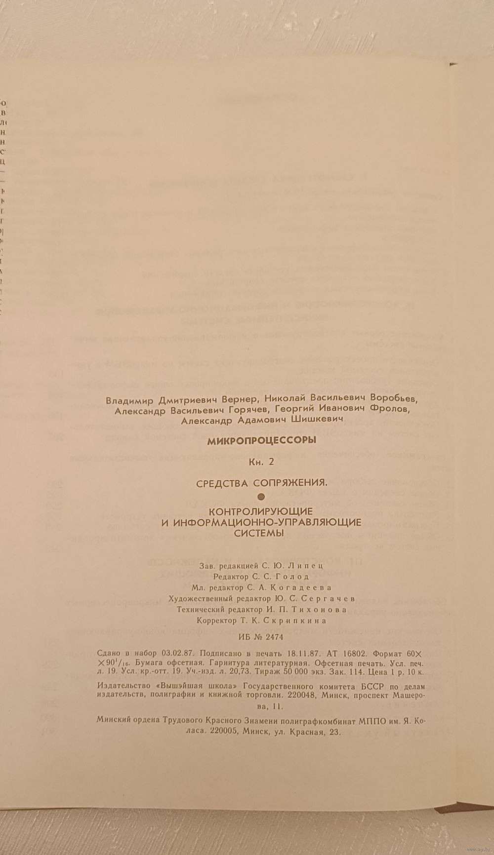 Микропроцессоры: В 3 кн. Кн. 2: Средства сопряжения. Контролирующие и информационно-управляющие системы: Учеб. для техн. вузов /В. Д. Вернер, Н. В. Воробьев, А. В. Горячев и др.; Под ред. Л. Н. Преснухина. — Мн.: Выш. шк., 1987. - 303 с.: ил., твёрдый переплёт.